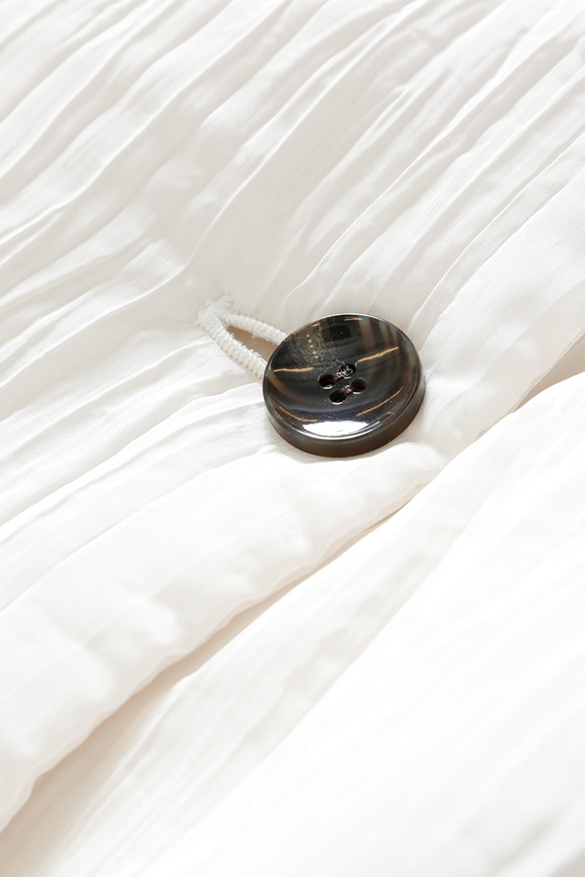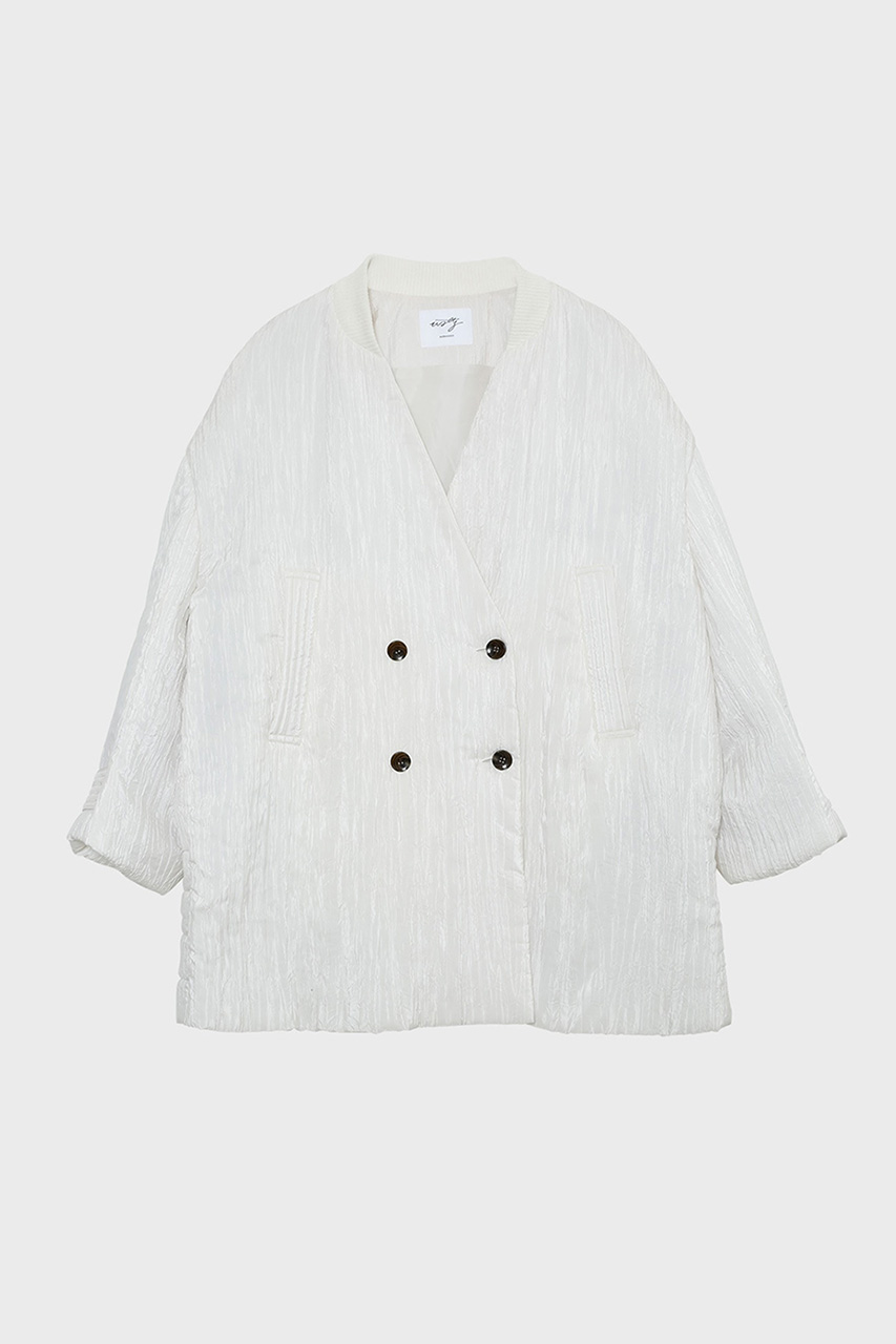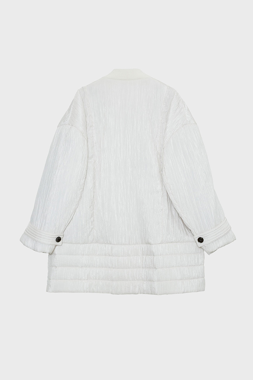 ボリューム感が新鮮なショートコート。ランダムなシワ加工が施された表面は豊かな立体感と、衿もとのソフトなリブ素材で軽さをプラスし、女性らしさを感じさせるバランスに仕上げました。