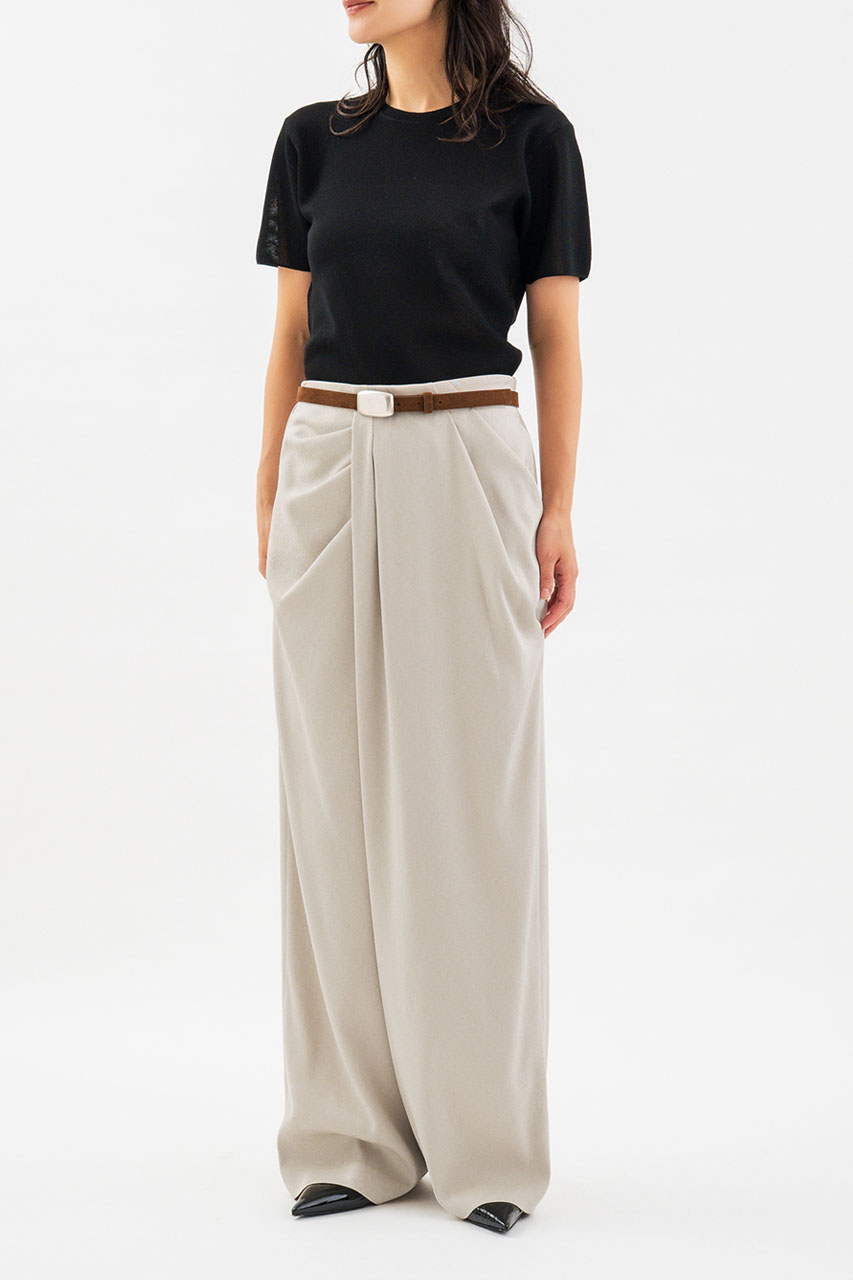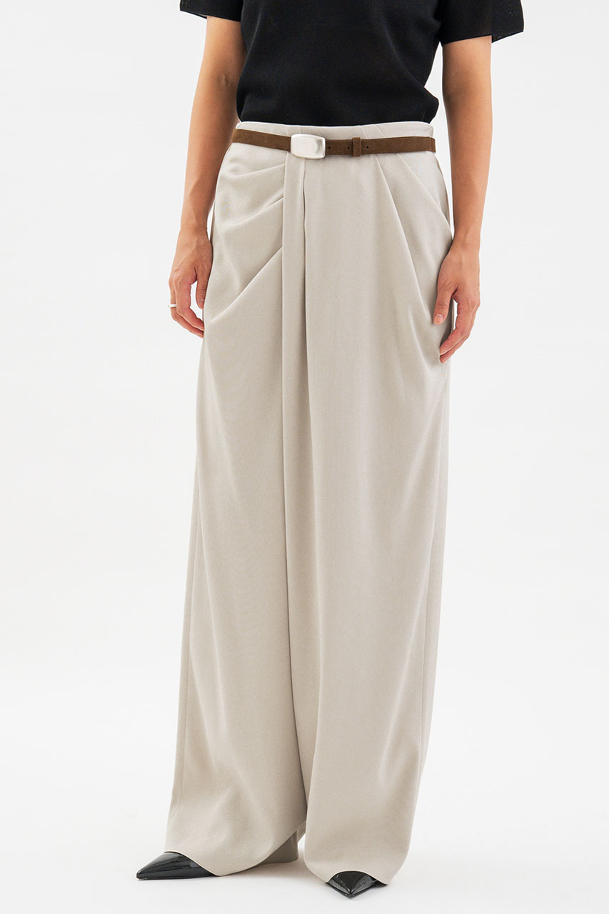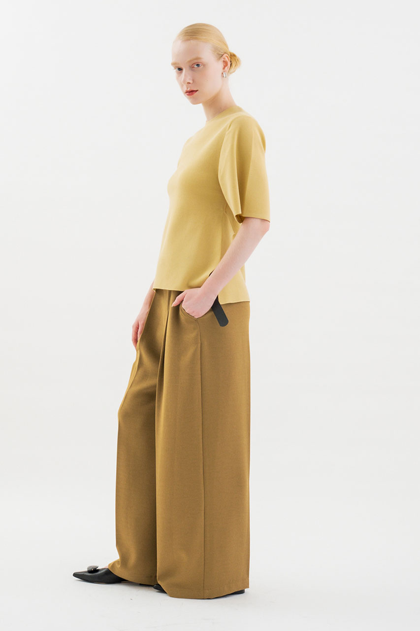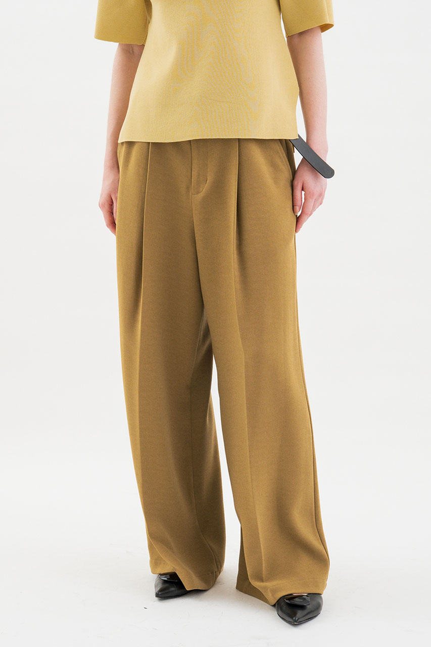 ボタンは生地と同系色のマットなメタル素材を使用し、ミニマルなアクセントに。タックとセンタープレスのディテールが、全体を引き締めながらスタイルアップも叶えます。ウエストはゴム仕様で、リラックスして履けるのもポイント。