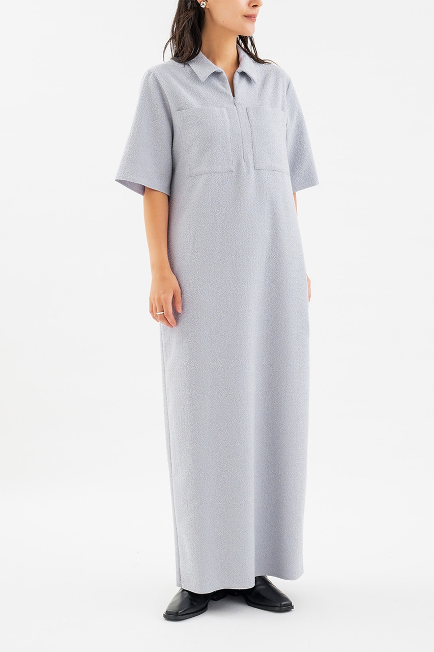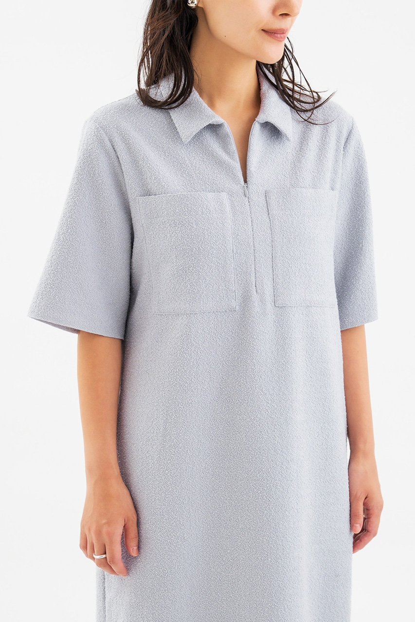 心地よくリラックスして纏える、快適さが魅力のワンピース。太い糸と細い糸を組み合わせた凹凸感のある生地は肌触りが良く、程よいハリ感があり通気性にも優れています。