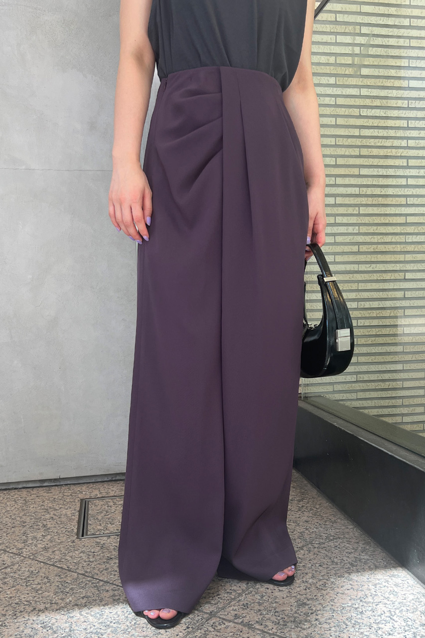 フロントに施されたアシンメトリータックが印象的な、モードな雰囲気のパンツ。落ち感のある生地を使用し、ワイドシルエットながらもすっきりとした印象に。ウエストのゴム仕様にサイドジップを加え、リラックスして履けるのもポイント。