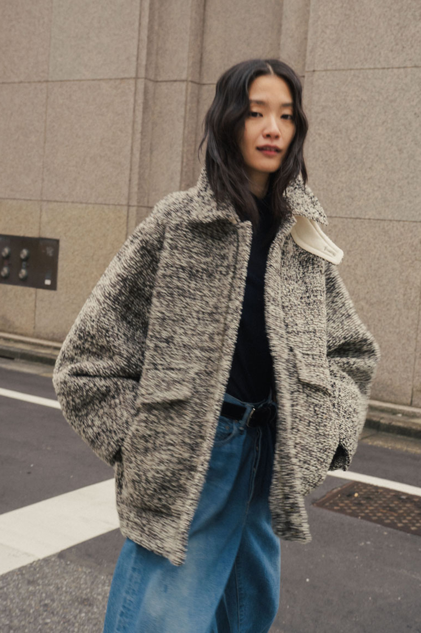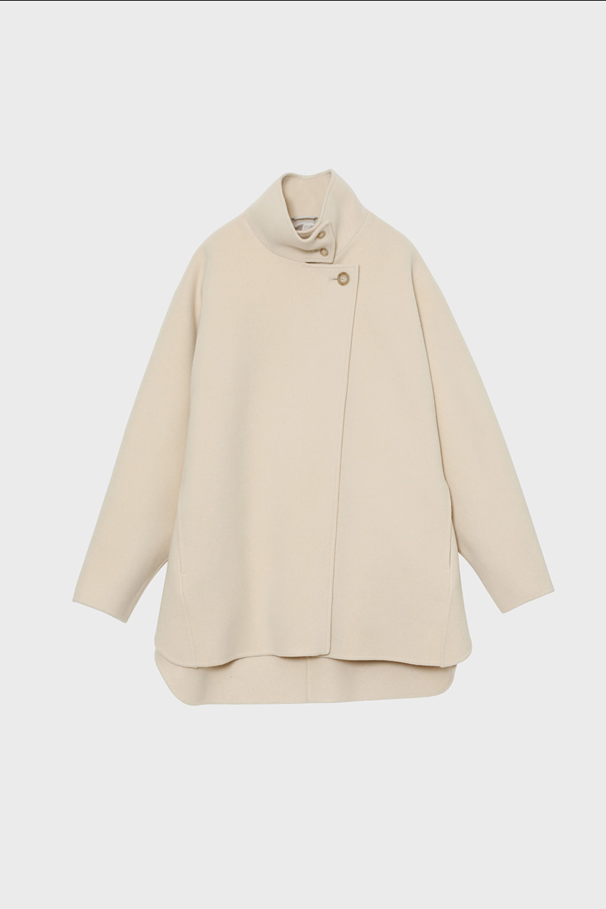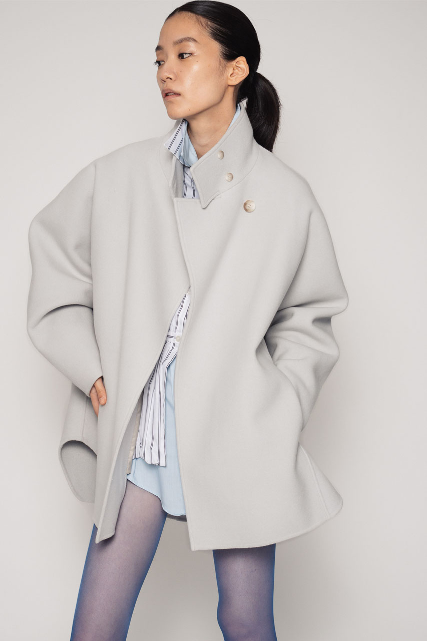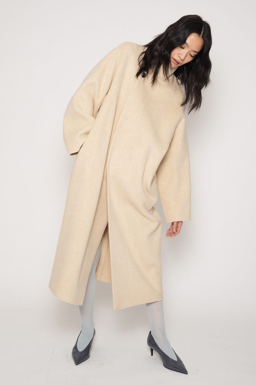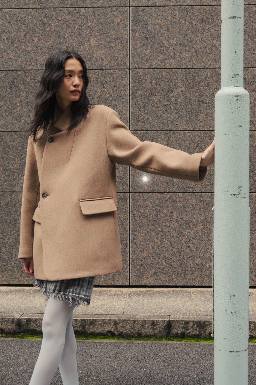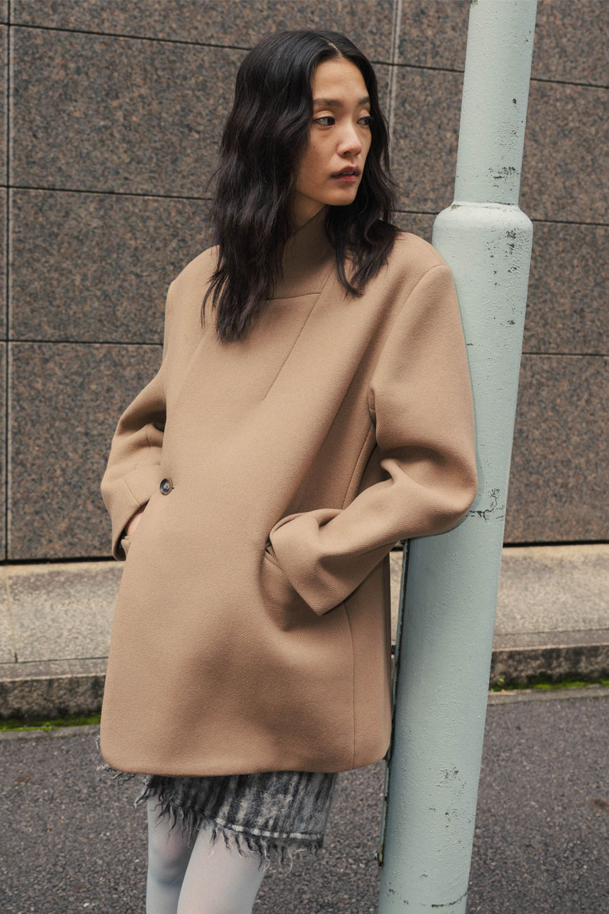 テーラードコートの襟を立たせたような、構築的なスタンドネックが印象的なミドルコート。シンプルながらモードなニュアンスのネックラインが今年らしいバランスを演出。ゆとりのあるショルダーとボクシーなフォルム、前合わせを深くとることで、開けて着た時に自然な動きとラフ感を生み出します。