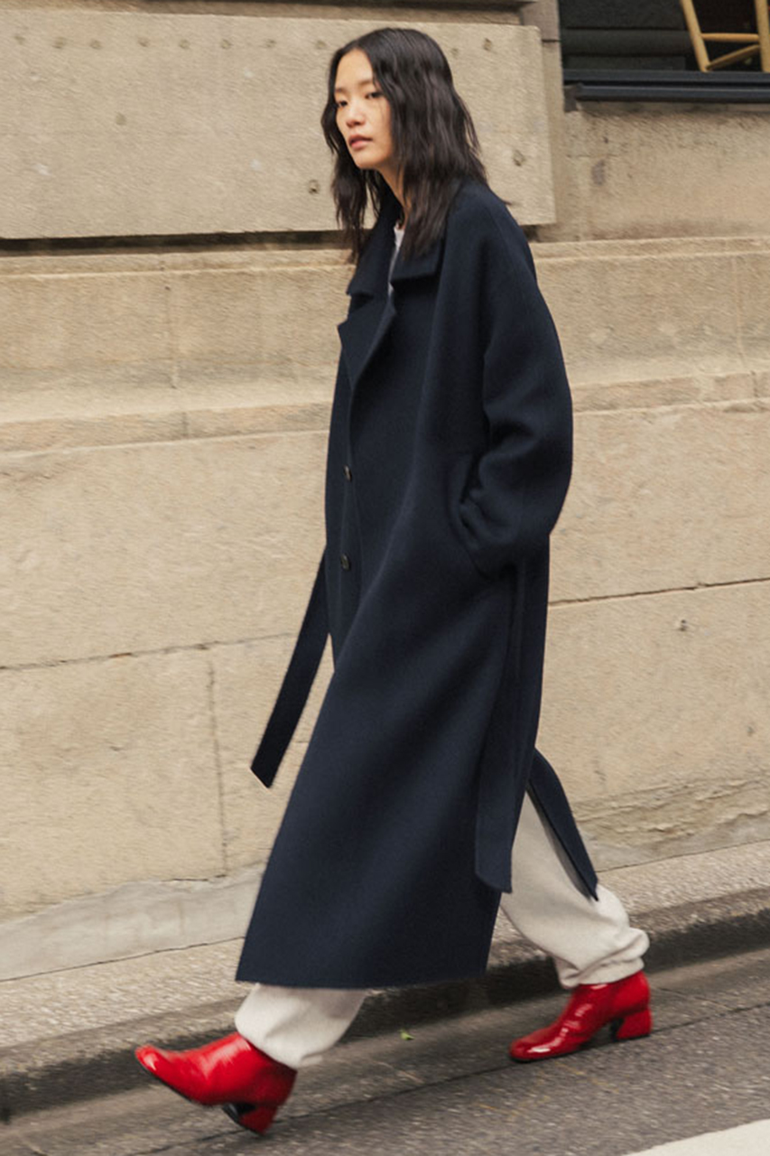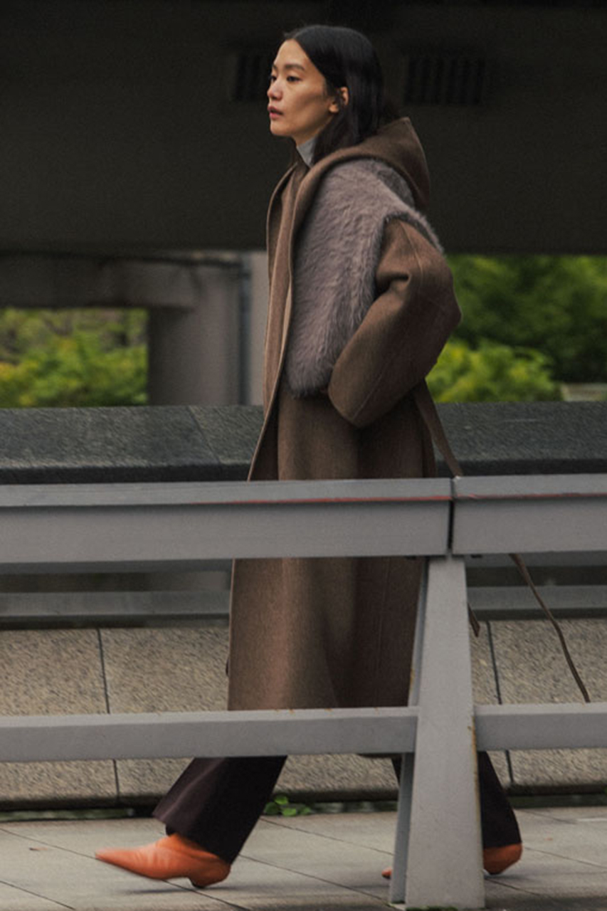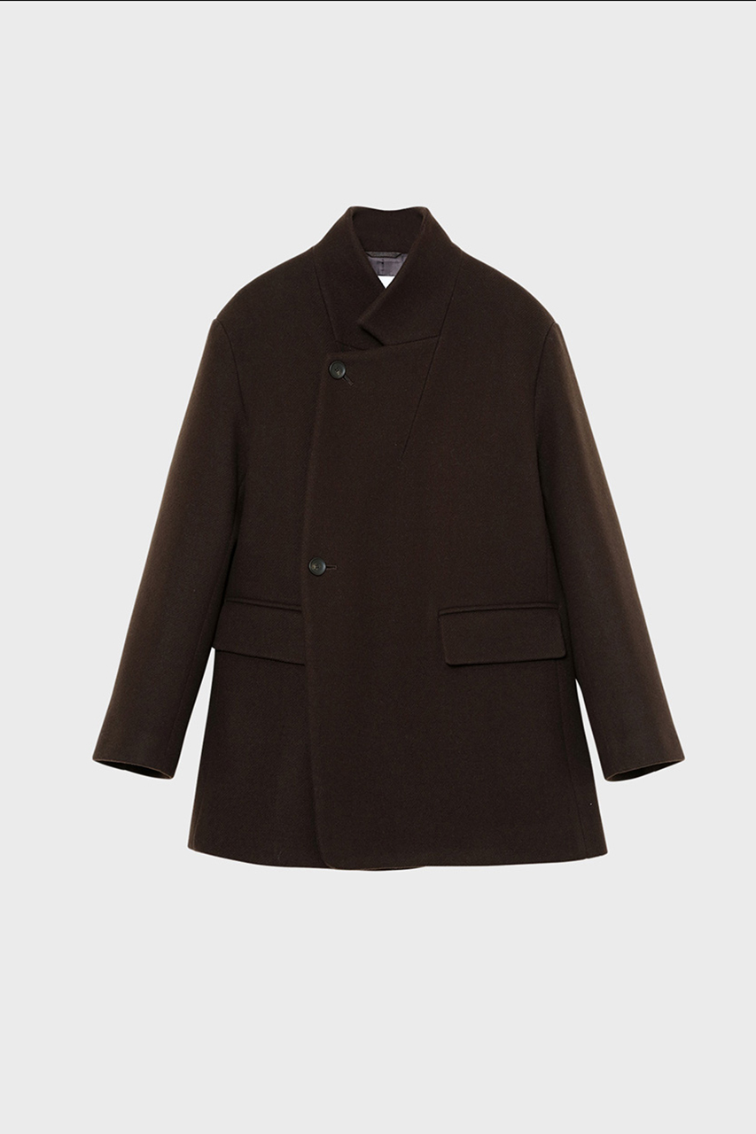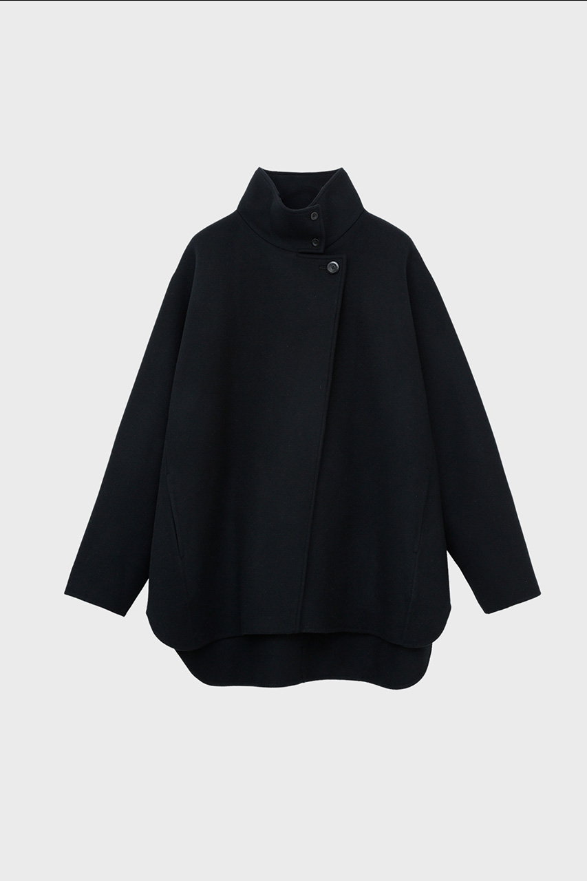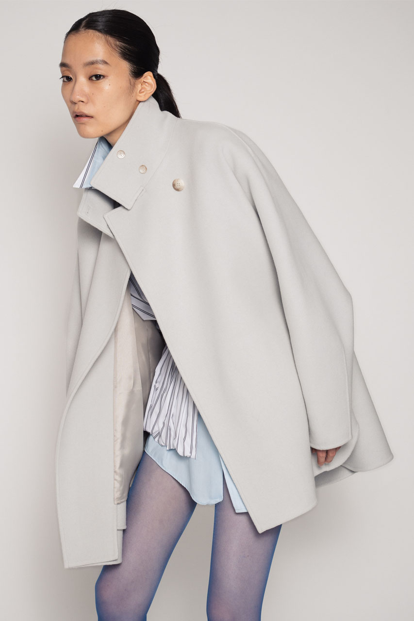 テーラードコートの襟を立たせたような、構築的なスタンドネックが印象的なミドルコート。シンプルながらモードなニュアンスのネックラインが今年らしいバランスを演出。ゆとりのあるショルダーとボクシーなフォルム、前合わせを深くとることで、開けて着た時に自然な動きとラフ感を生み出します。