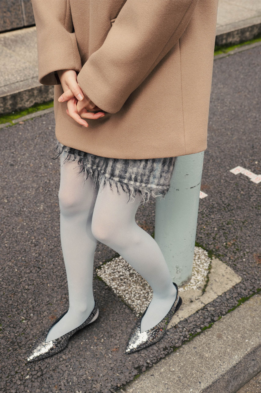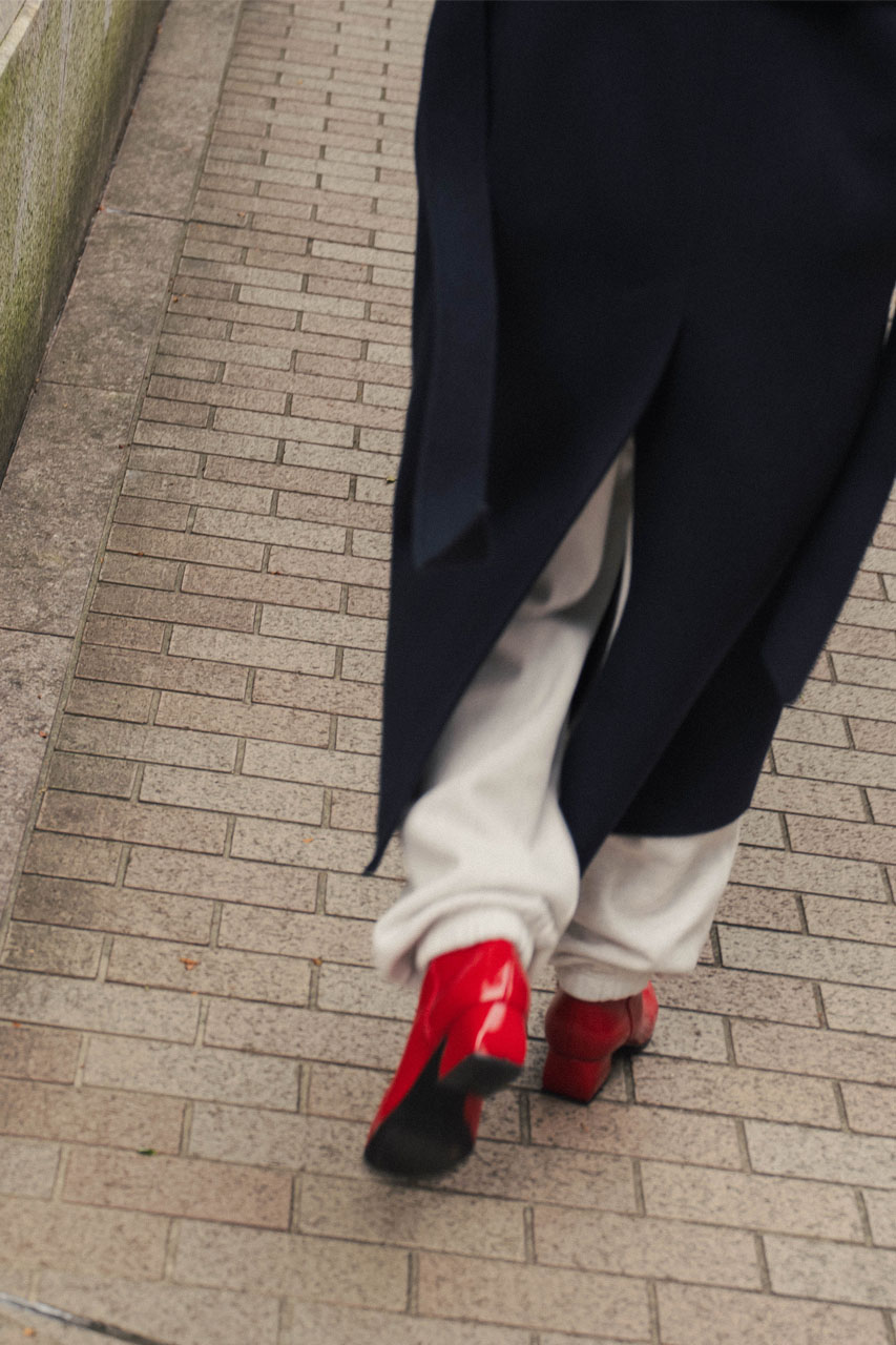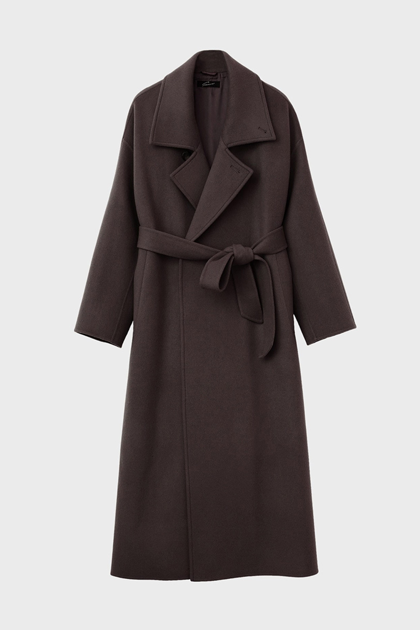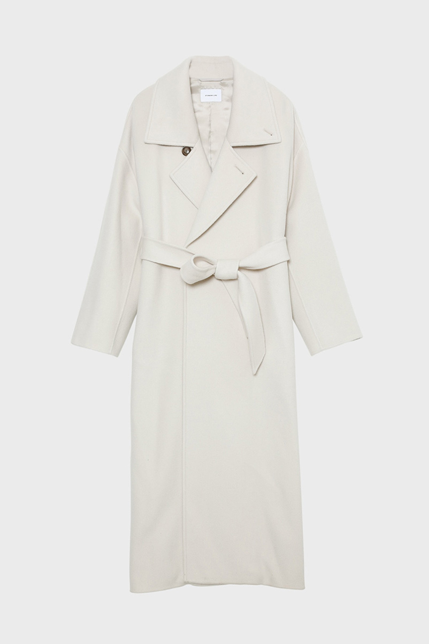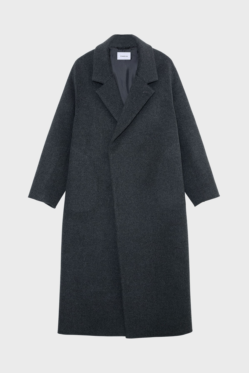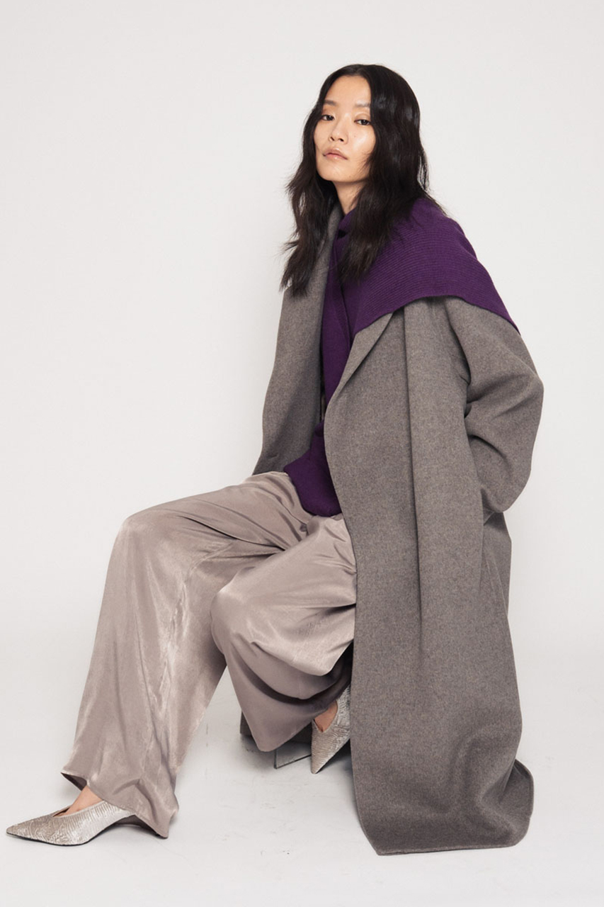 テーラードコートの襟を立たせたような、構築的なスタンドネックが印象的なミドルコート。シンプルながらモードなニュアンスのネックラインが今年らしいバランスを演出。ゆとりのあるショルダーとボクシーなフォルム、前合わせを深くとることで、開けて着た時に自然な動きとラフ感を生み出します。