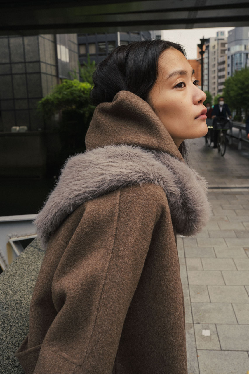 ヤクのしっとりとした柔らかさとキャメルの上品なコシが見事に調和した贅沢なフーディーコート。高級素材にあえて、ショールカラー風のフードデザインを取り入れたスタニングらしさがポイント。ハンドメイドならではの丁寧な仕立てが映える逸品。