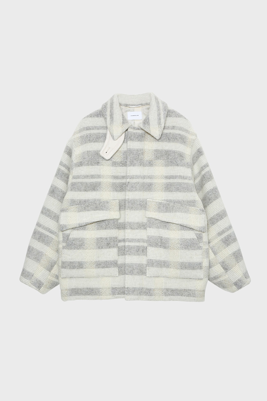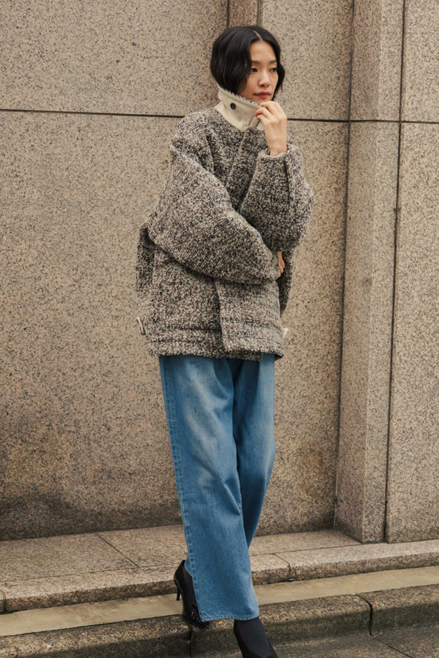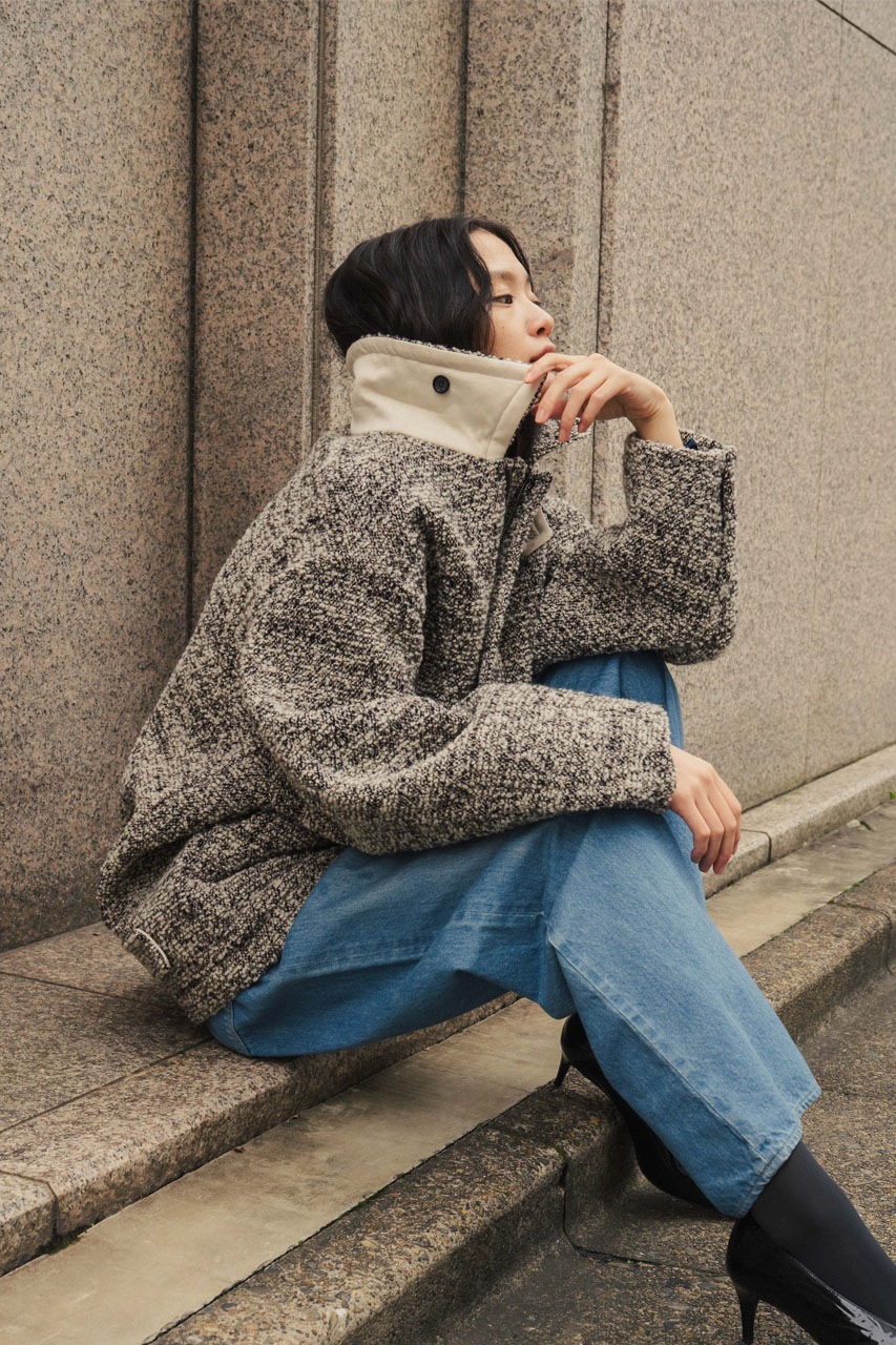 イタリア製の上質なホワイトベースチェック生地と、立体感のあるミックスツイードを組み合わせたブルゾン。裾のギャザーと袖のふくらみが奥行きのあるシルエットを演出。カジュアルスタイルに上品な雰囲気をプラスする一着。