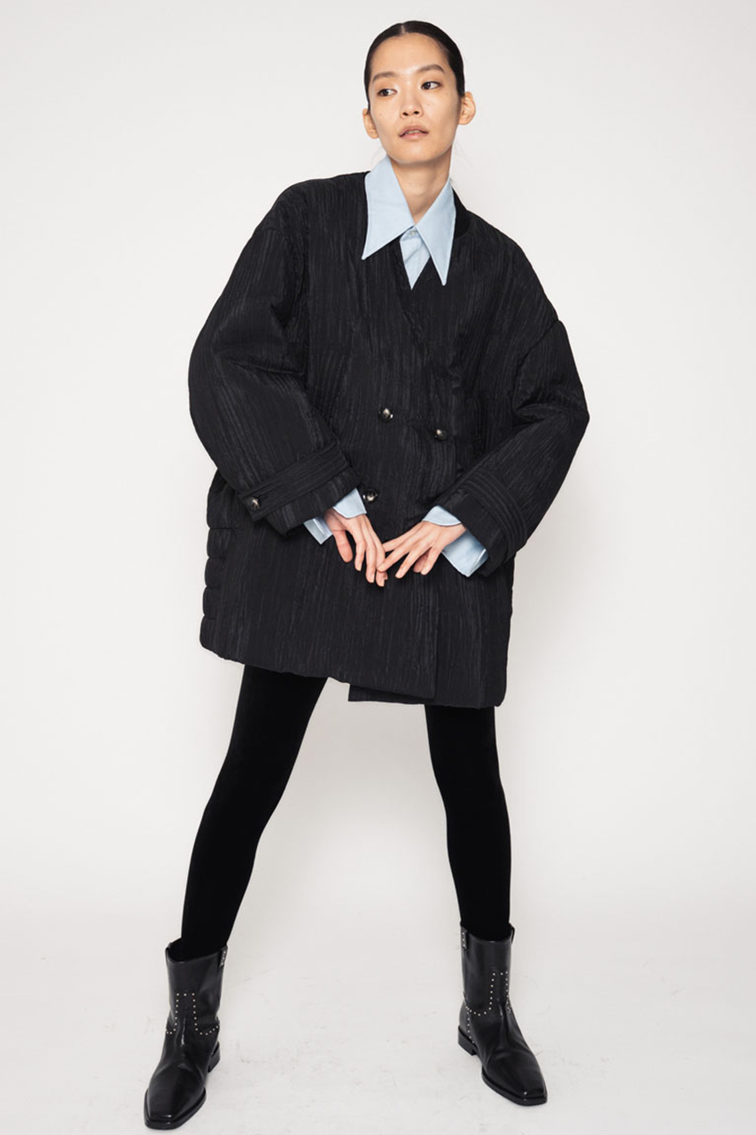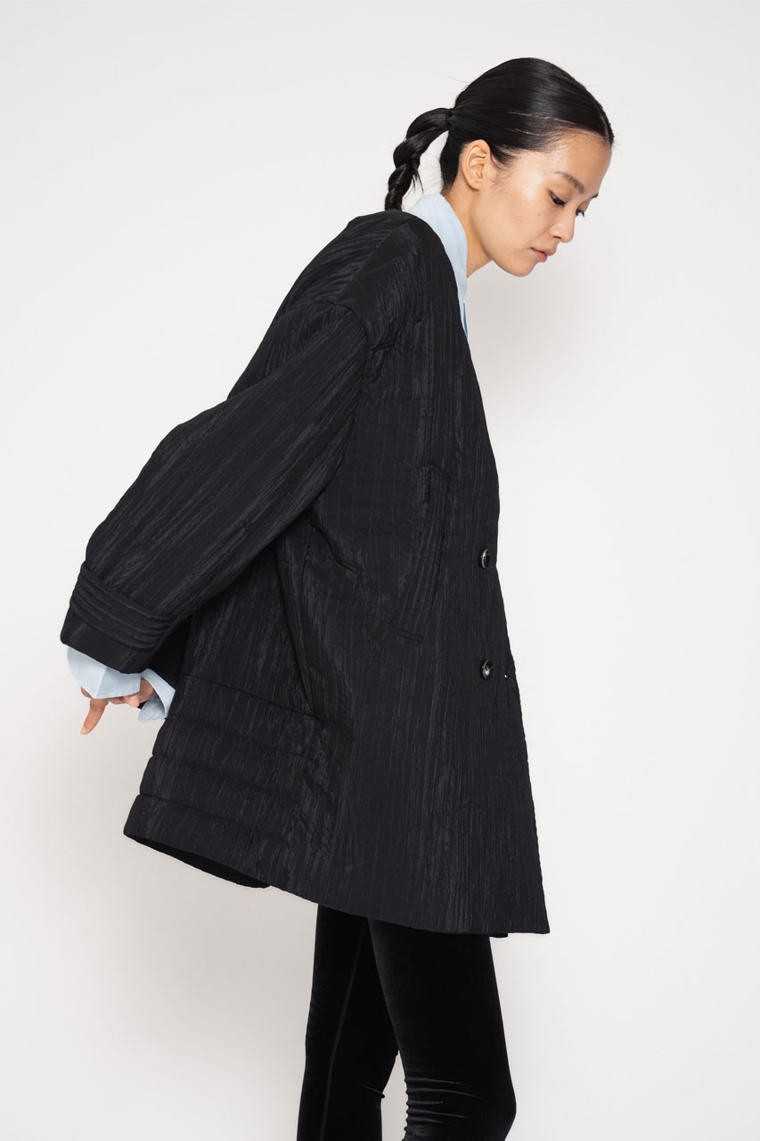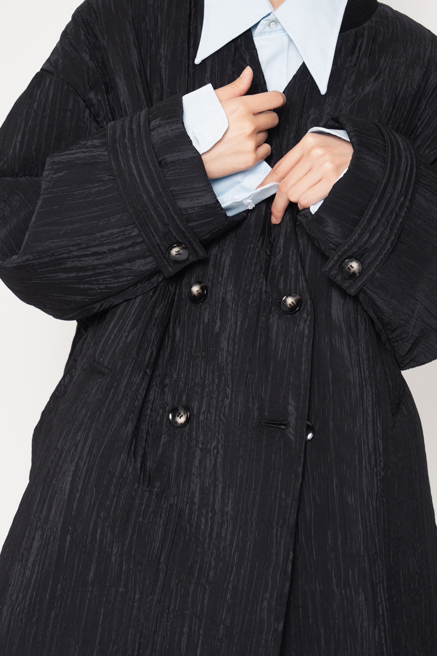 ふんわりとしたボリュームが新鮮な印象を与えるショートコート。表面のランダムなシワ加工が立体感を生み、衿もとのリブ素材が軽やかさをプラス。スポーティになりすぎず、ほどよい女性らしさを添えてくれます。細部にまでこだわりを詰めた、存在感と軽やかさを両立する一着です。