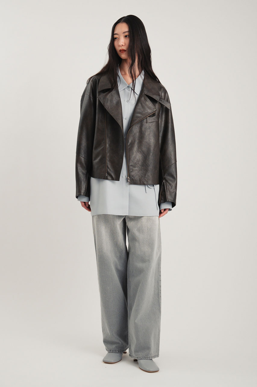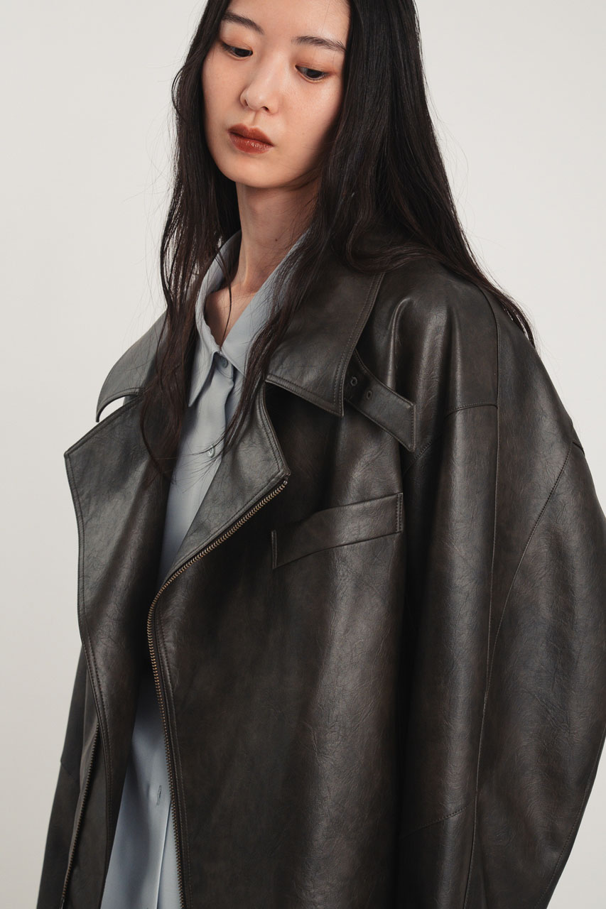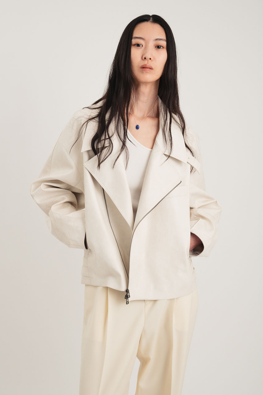 ヴィンテージのような色むらと深みのある風合いのある素材を使ったミニマルなライダースブルゾン。深めに設定した襟回りのデザインは顔をすっきりと見せてくれ、閉めた時にも苦しくなく、ほどよいゆとりがあります。パターンの切替に拘り、また、内側に芯を張ったことで美しい袖フォルムが叶いました。ハードに見えがちなライダースを、女性らしさを引き立てるバランスに整え、大人のスタイリングにも品よくなじむ一着です!
