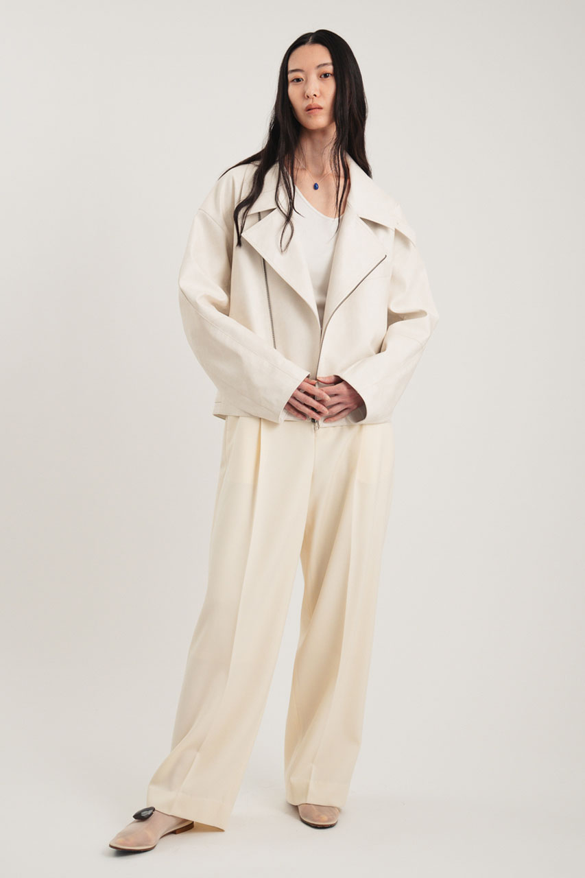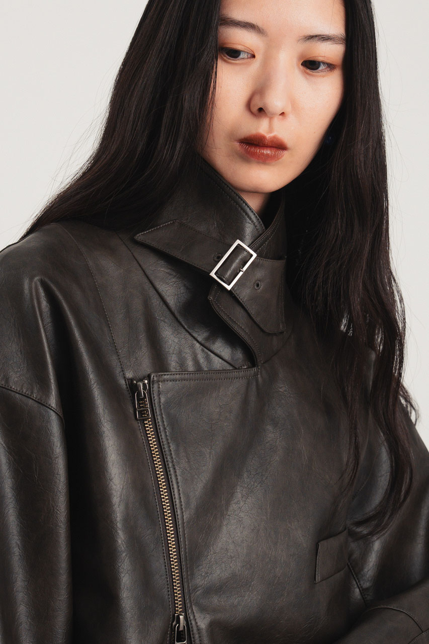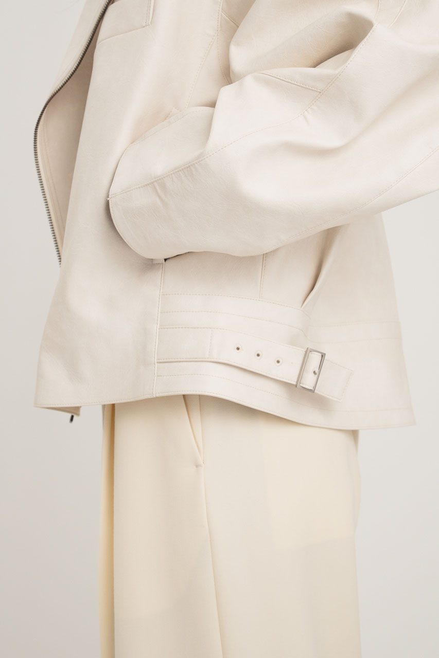 ヴィンテージのような色むらと深みのある風合いのある素材を使ったミニマルなライダースブルゾン。深めに設定した襟回りのデザインは顔をすっきりと見せてくれ、閉めた時にも苦しくなく、ほどよいゆとりがあります。パターンの切替に拘り、また、内側に芯を張ったことで美しい袖フォルムが叶いました。ハードに見えがちなライダースを、女性らしさを引き立てるバランスに整え、大人のスタイリングにも品よくなじむ一着です!