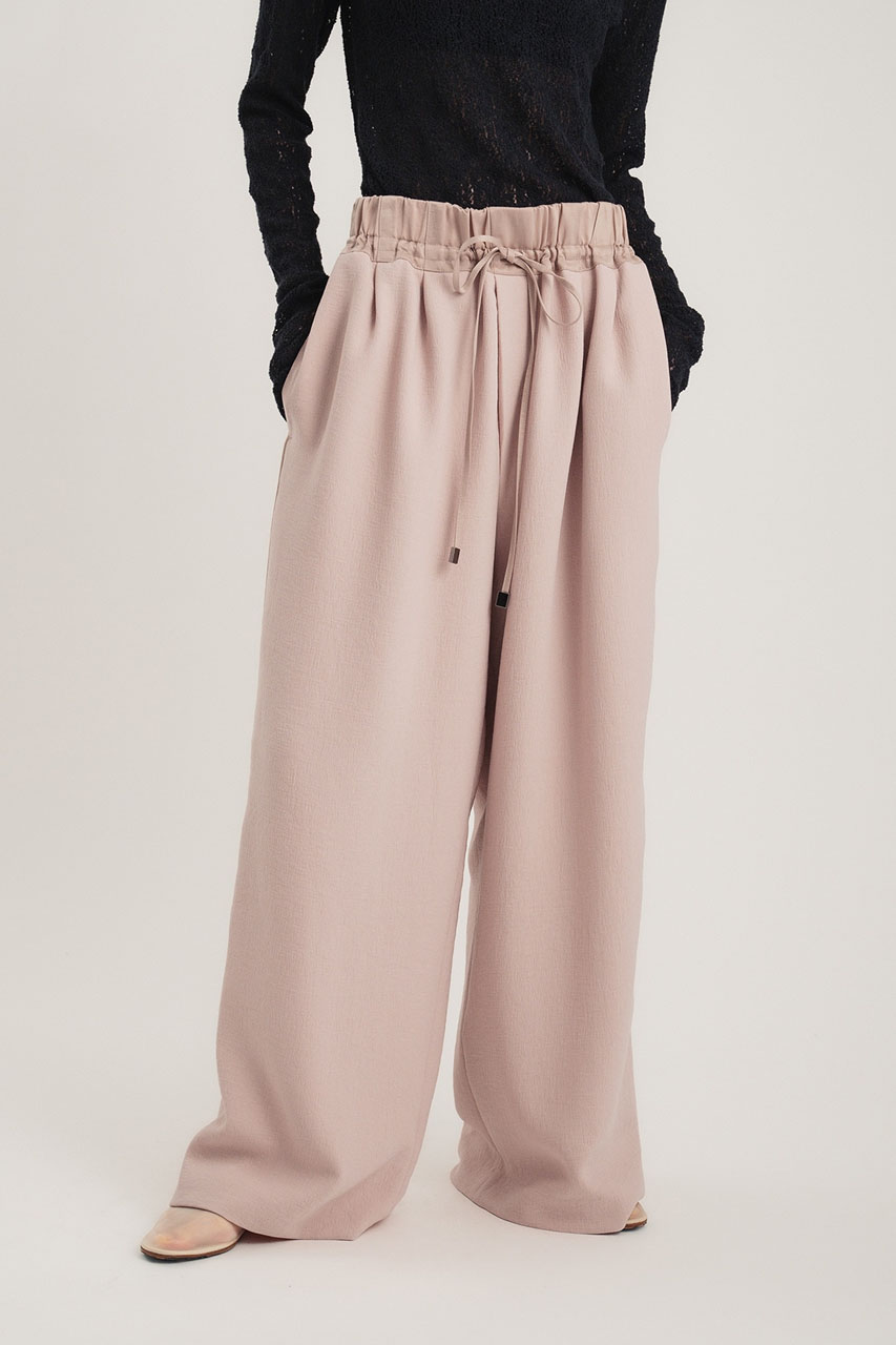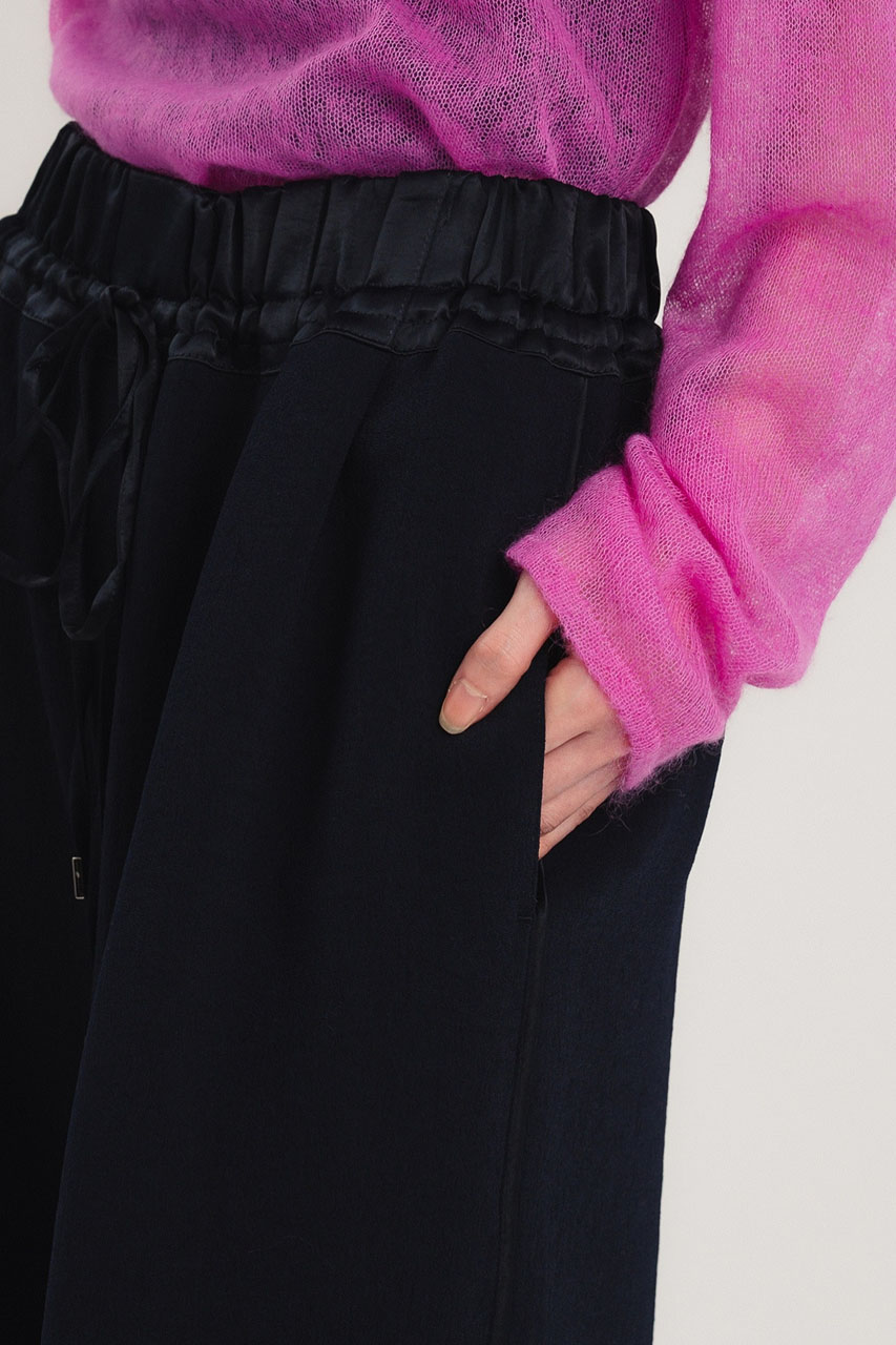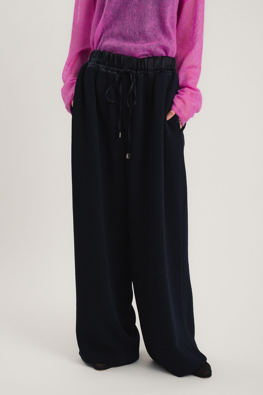 昨年大好評の心地よい肌当たりとリラックス感が魅力のイージーパンツが今年も登場!伸縮性ある素材に仕上げるために特別に加工を施した糸を使用しています。ウエストの異素材切替えやサイドラインなど、スポーティーなテイストを加えたデザインがポイント。ワイドなシルエットと落ち感のある生地が、歩くたびに表情を生み、女性の中のハンサムさをプラス。縦のラインが強調され、すっきり見えが叶うのも魅力です!