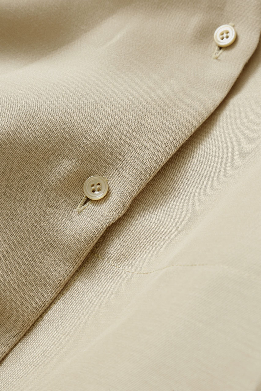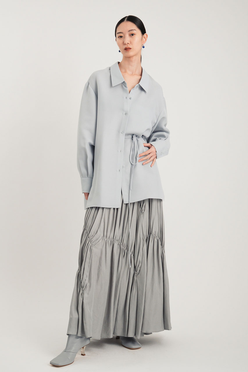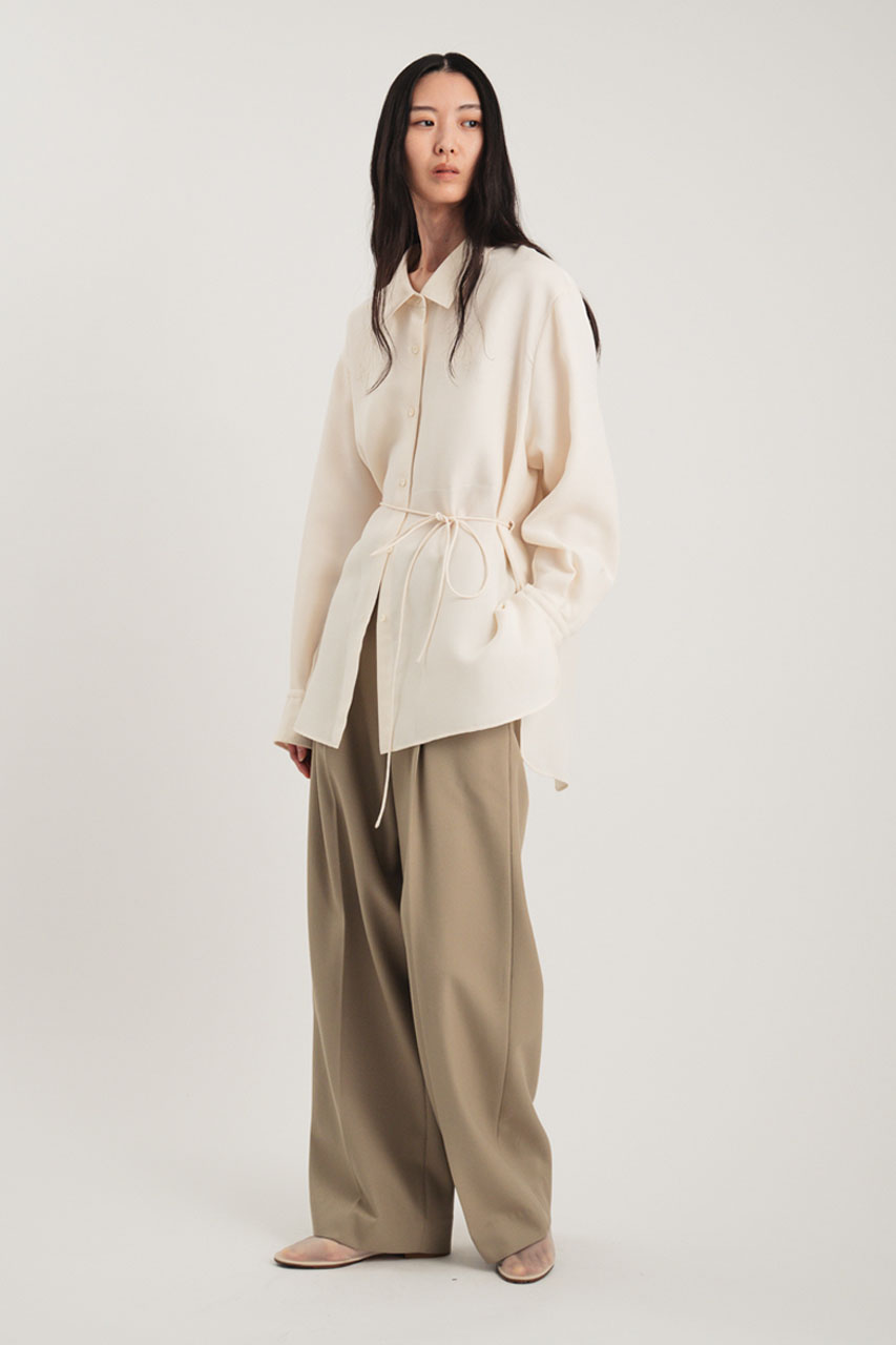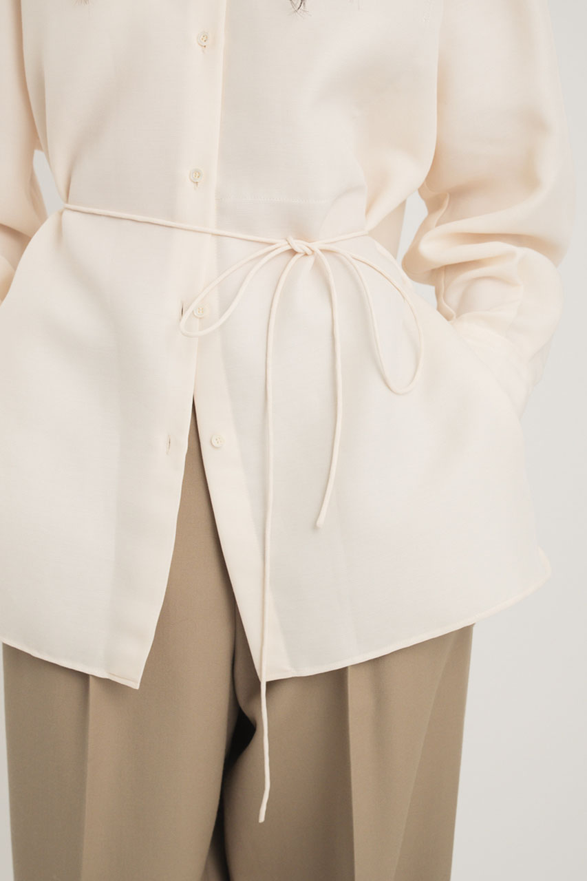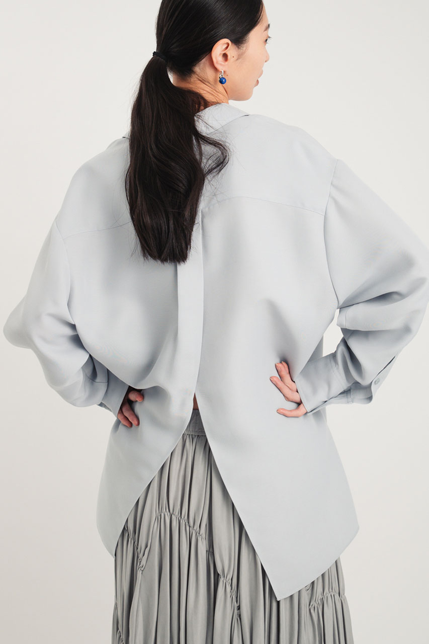 バックスリットが目を惹くモダンなシャツ。透明感と上品な光沢が魅力の素材が知的な雰囲気を映し出し、深く開いたネックラインはヘルシーな女性らしさを演出してくれます。ポイントのバックスリットは、付属の布紐でウエストマークすることで異なる表情を楽しめ、カジュアルからきれいめまで、幅広い着こなしに対応。さりげない華やかさでスタイリングをアップデートする一枚です。