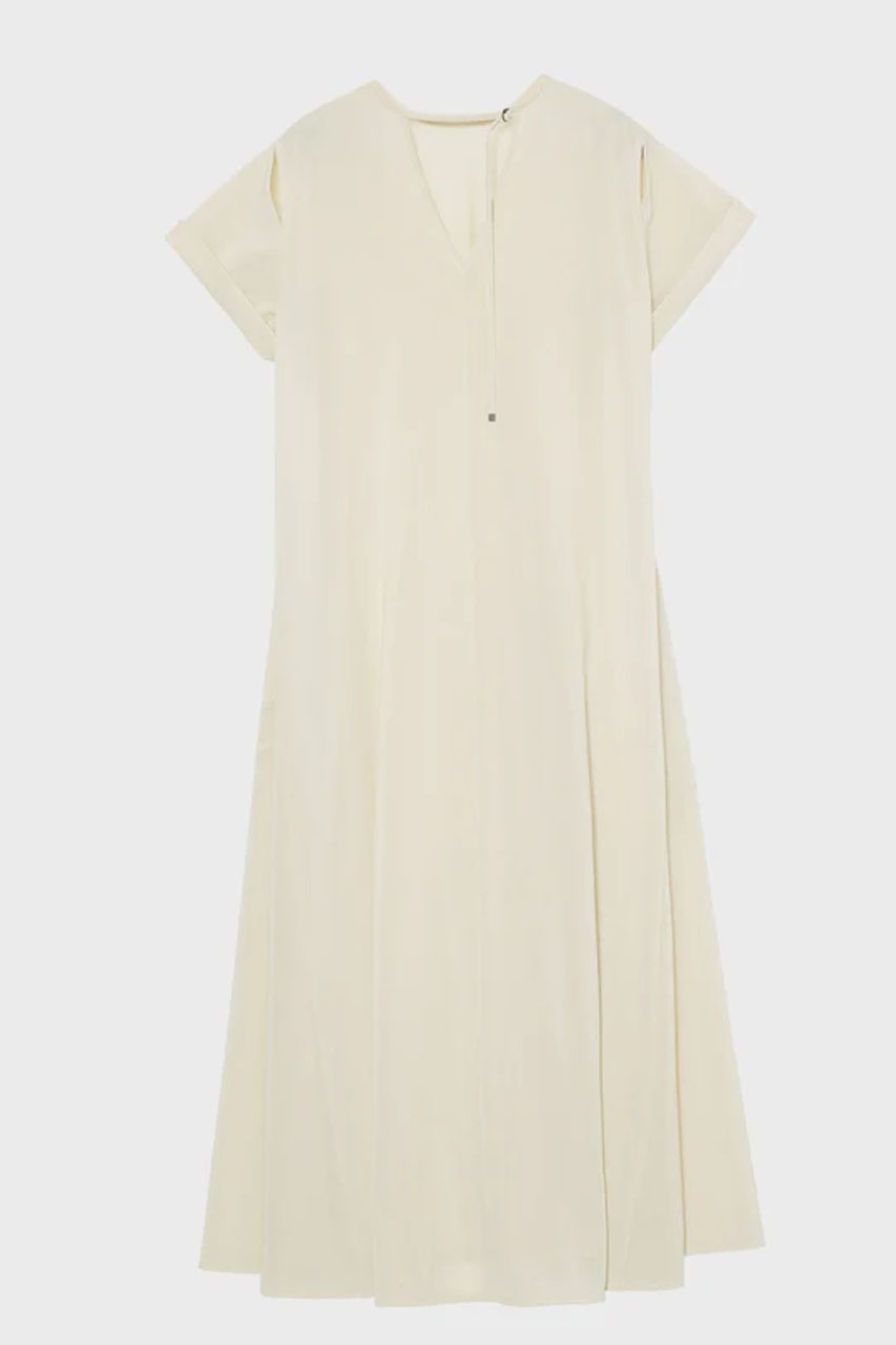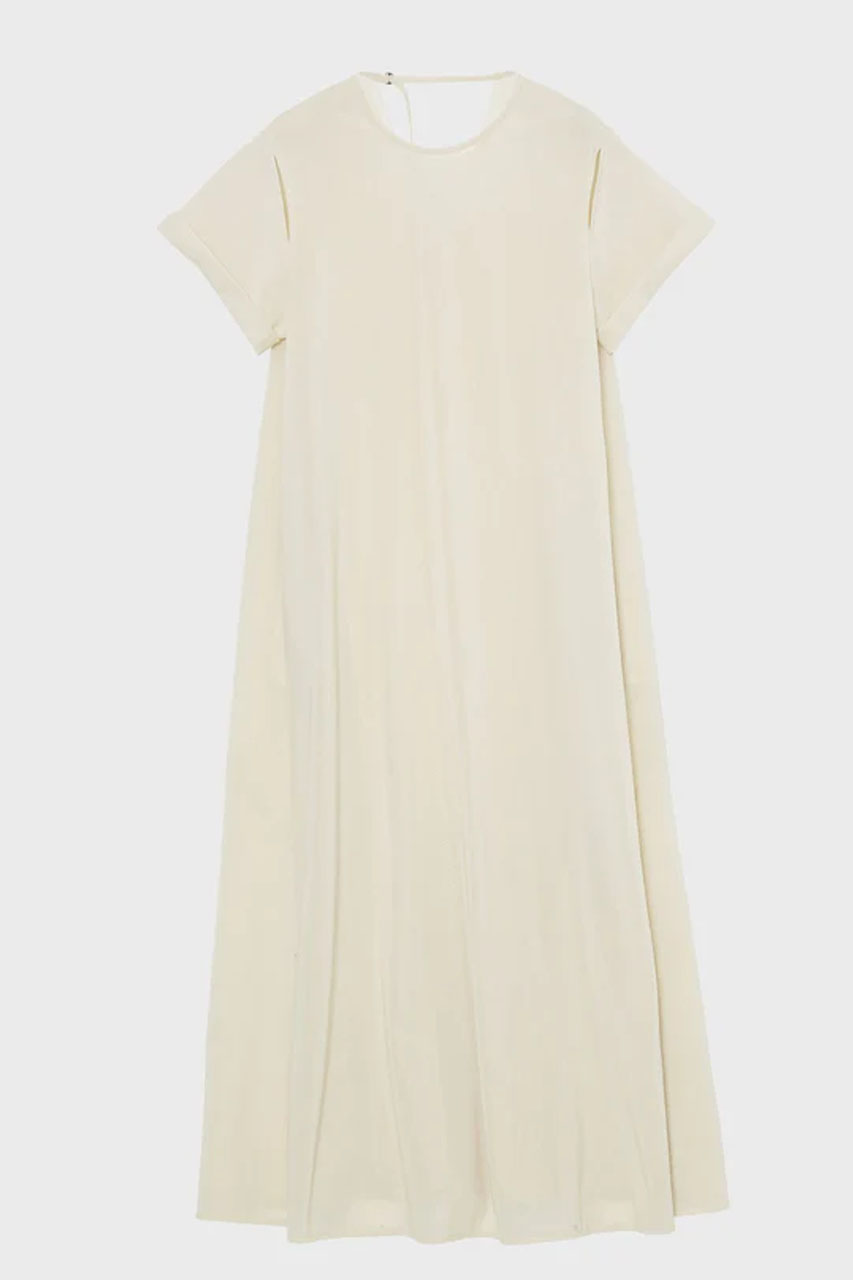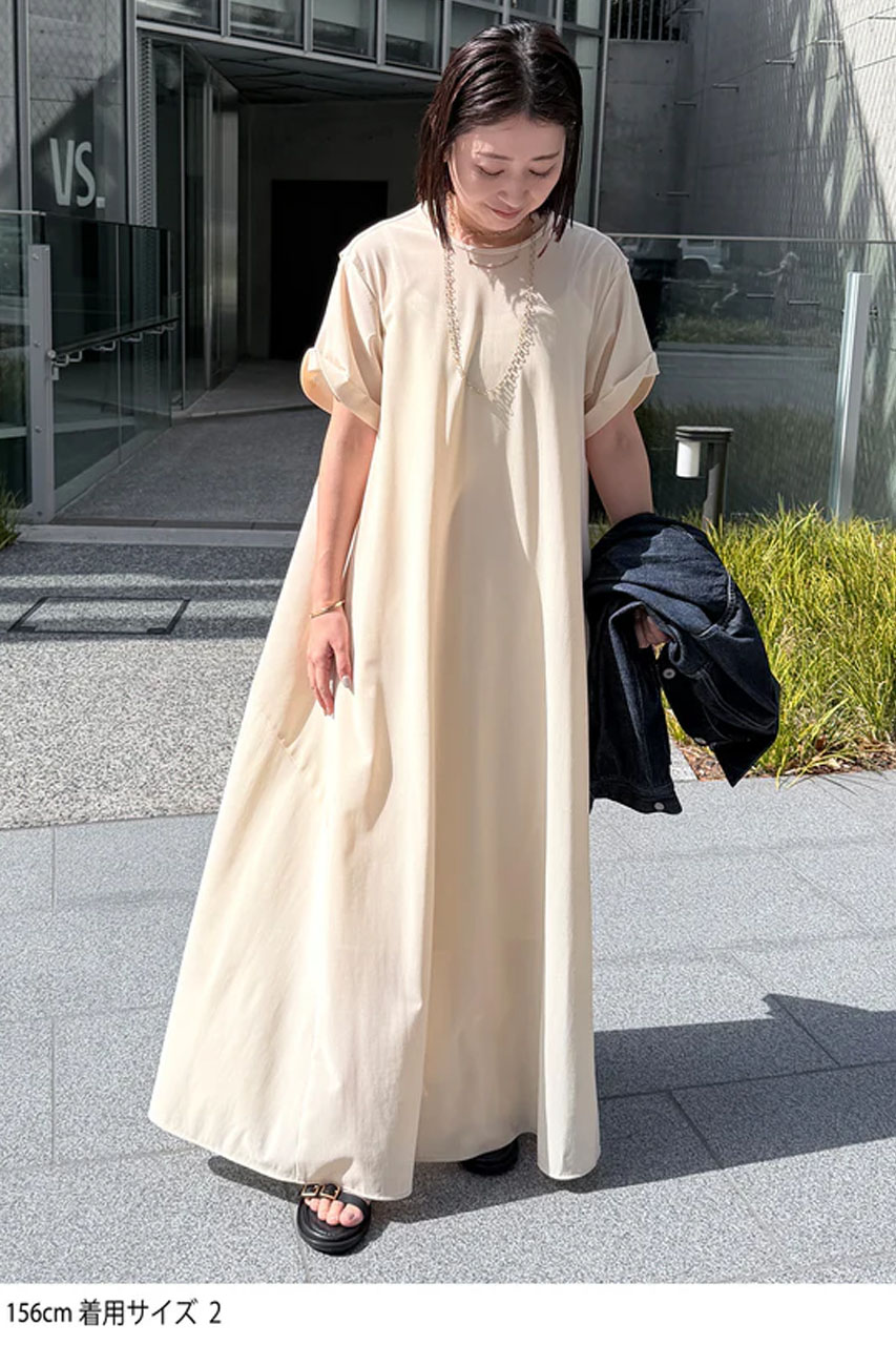 程よいドレス感とラフさを兼ね備えたロングワンピース。ナイロンメッシュを高密度に編み立て、ジャージでありながら布帛のようなハリ感を実現しました。シルエットを美しく保つ立体的なフォルムと、軽やかでストレスのない着心地も魅力。サイドの切替線が自然なAラインを描き、袖口のさりげないボリュームやアームスリット、バックのVネックが、女性らしさと抜け感をプラスします。フラットサンダルやスニーカーを合わせるだけで、肩の力が抜けた大人のカジュアルスタイルが完成。ジャージならではの快適さでデイリーに活躍する一枚です。