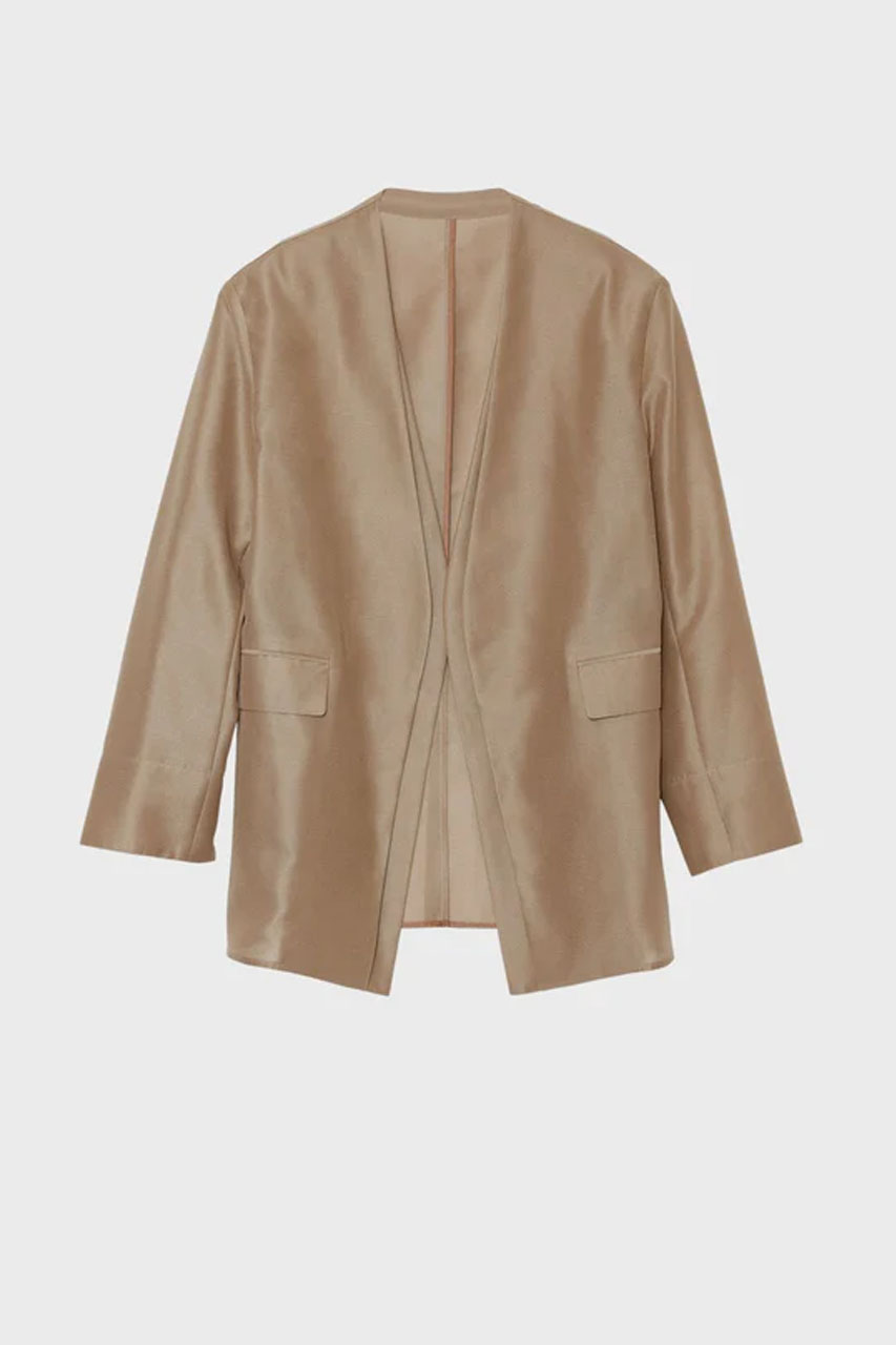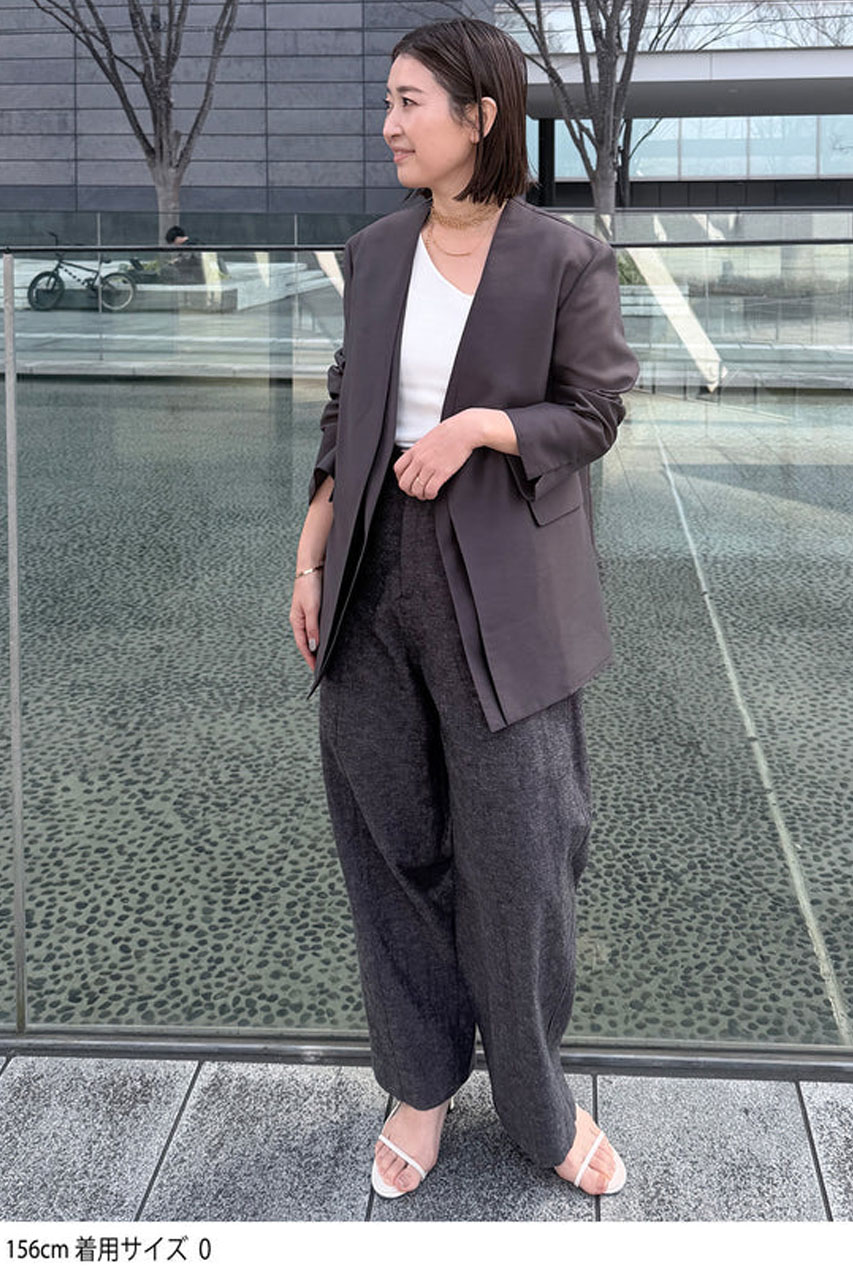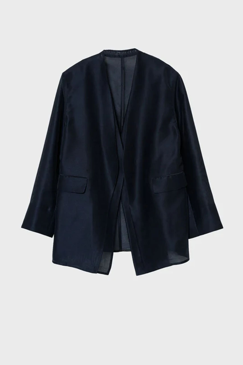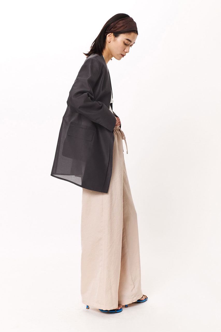 オーガンジー素材で羽のように軽いジャケット。20Dの高品質ポリエステルを採用した透け感のある素材で、軽やかな着心地が魅力です。取り外し可能な肩パッドやボタンレス仕様を組み合わせ、きちんと感は残しつつもカッチリしすぎないバランスに。前立てを二枚仕立てにすることで、さりげないニュアンスと奥行きもプラスしてくれます。控えめな光沢が上品さを引き立て、デイリーから特別なシーンまで幅広く活躍する一着です。