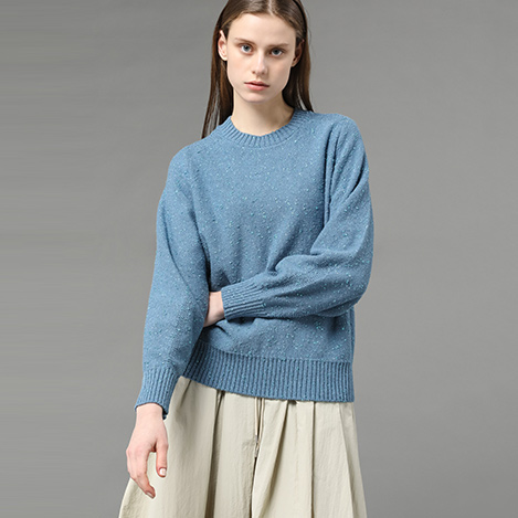 同素材のプルオーバーは、パンツでもスカートでもバランスよくスタイリングが可能です。ベーシックに着まわせるオフホワイト、ベージュと、きれいなブルーもラインアップ。