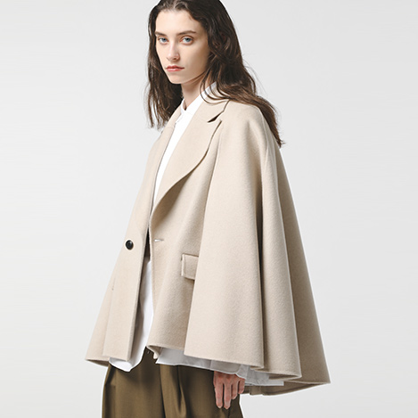 柔らかな梳毛のドレープ感と、直線的なトップのヘムがスパイスとなり、1枚で着ても重ね着してもドラマチックな装いになるよう仕上げています。