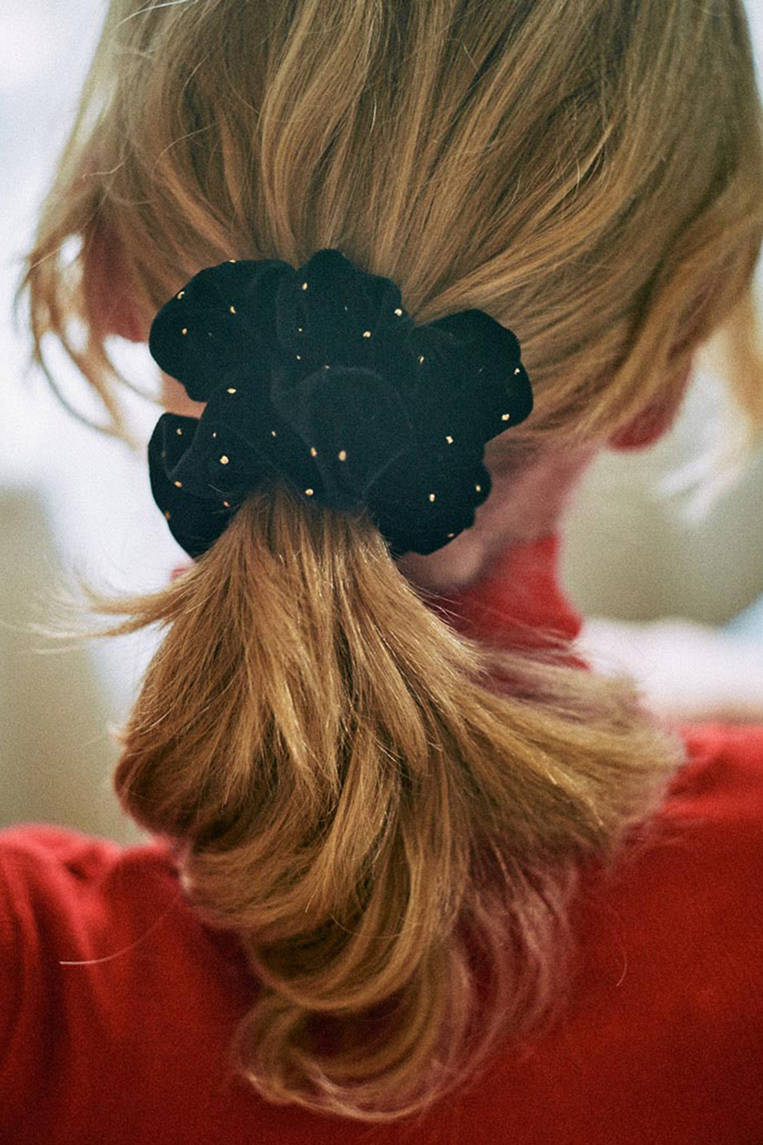 ベロア素材にゴールドのドットビーズをあしらった、程よいボリュームのシュシュ。髪をひとつにまとめるだけでスタイルを格上げしてくれる、普段使いにもおすすめの一品です。