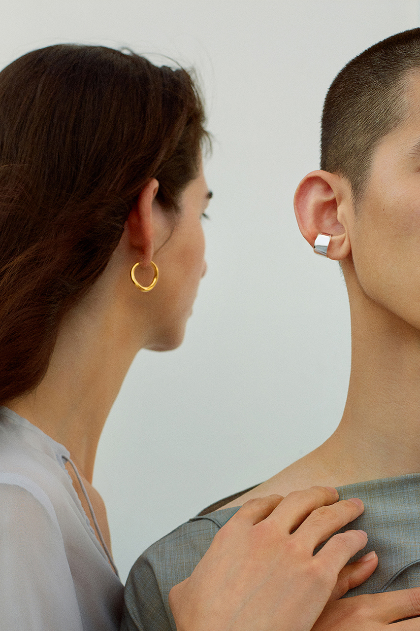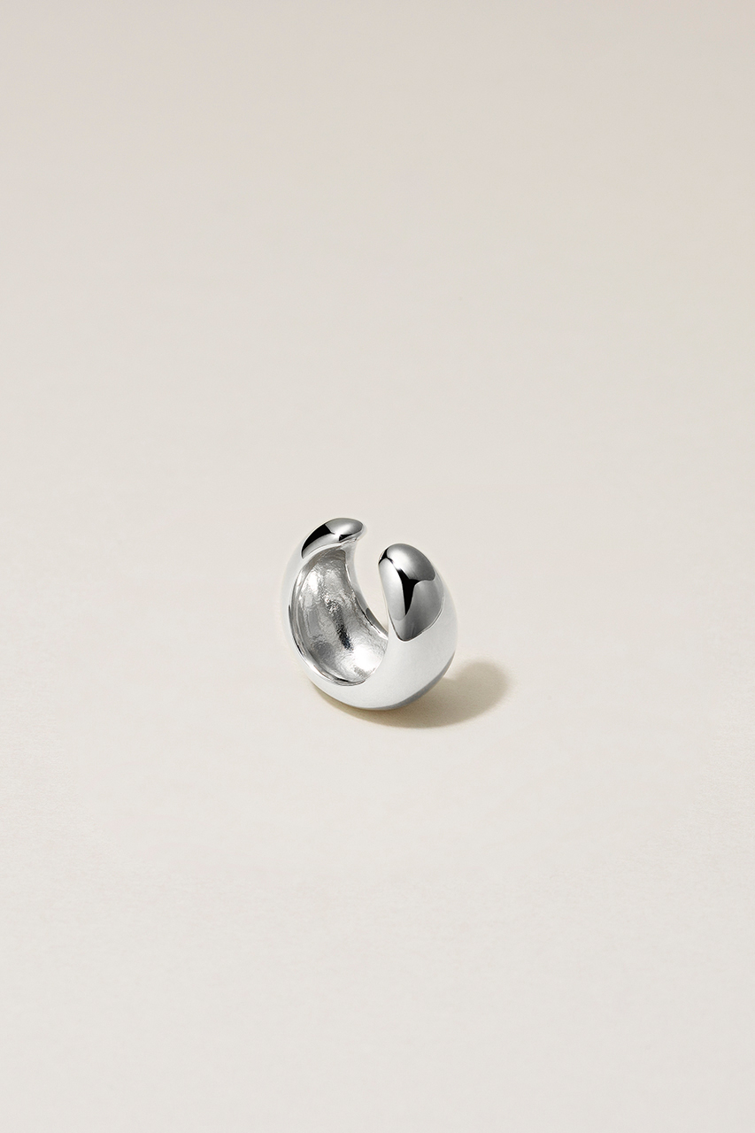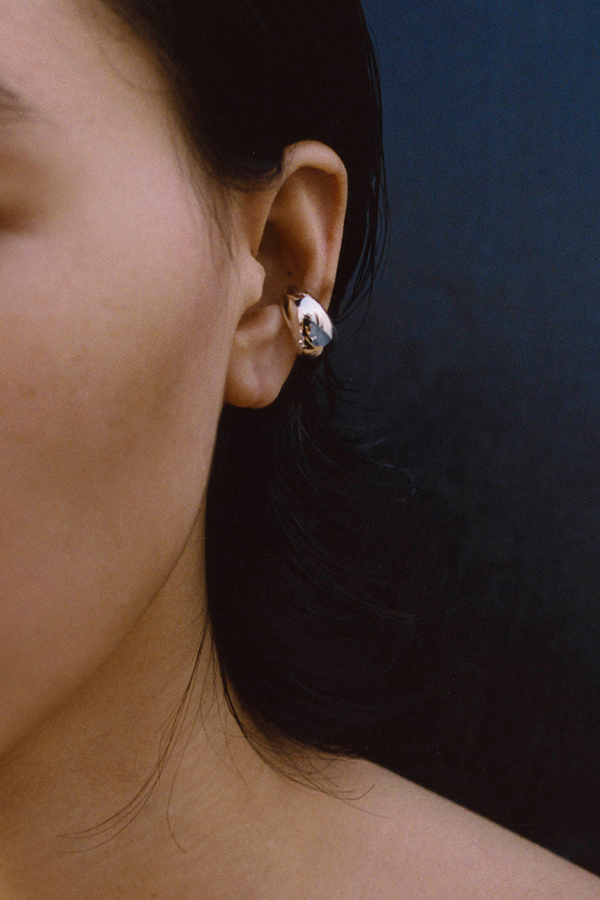 ボリュームのあるプレートタイプのイヤーカフは、光をしっかりと受け止めながらもスタイリングになじみやすく、ひとつで装いのアクセントに。