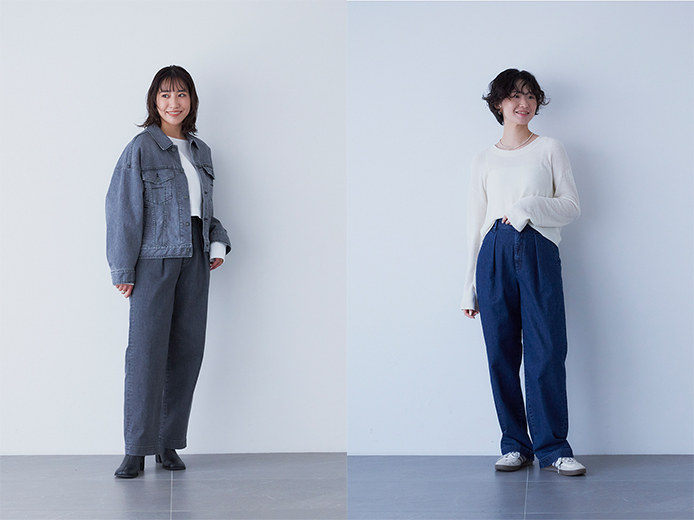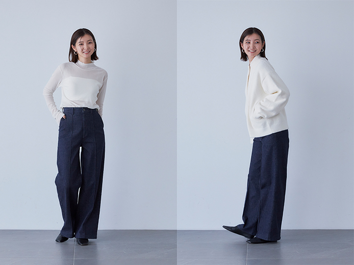 センターに入ったピンタックがタテのラインを強調し、ルーズになりすぎないきれいワイドストレートシルエットです。ヒップ下に少しゆとりがあり抜け感がありつつも、腰回りはすっきりとフィットする女性らしい一本です。