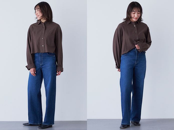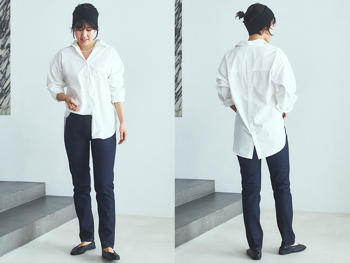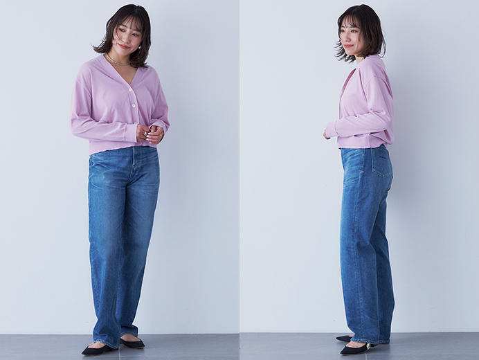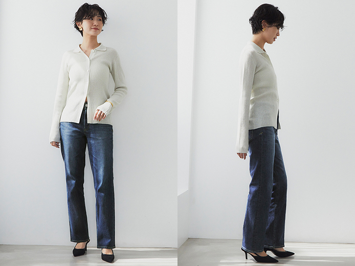 深さがある股上にゆるっとしたストレートが特徴のLEA。ゆとりのあるストレートは野暮ったくなりがちですが、LEAはパターンにこだわることで美脚に、そして脚長に見せてくれるYANUKらしいゆるストレートデニムです。