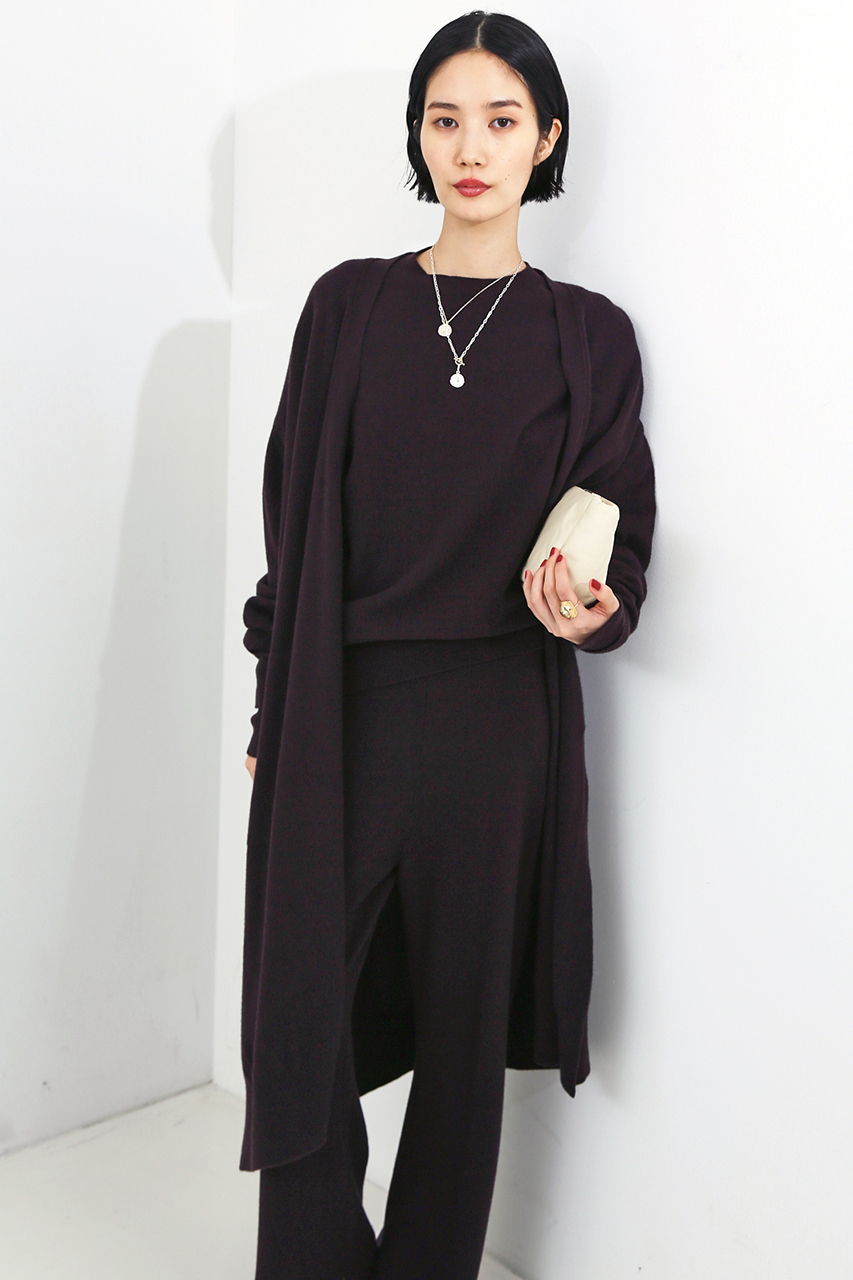 プルオーバーはベーシックなデザインだからこそ、サイジングや些細なリブ幅など細部までこだわり、毎日着たくなるような汎用性の高い一着に仕上げています。ニットパンツは、裾の内側に入ったスリットとスッと落ちる美脚シルエットが秀逸なアイテム。ロングカーディガンは、纏った時のゆとり感や優美なシルエットに拘って設計。リュクスでエレガント、贅沢な着丈の一着です。なめらかでソフト、軽く暖かい、日本のカシミヤ専業メーカーが開発した秀逸なウール素材を使用。それぞれ単品で着まわしの効くアイテムですが、ニットアップとしての着用もおすすめです。