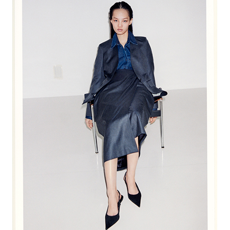 カジュアルすぎず、かしこまりすぎないメンズライクなジャケットには、同素材でシルエットが美しい巻きスカート風のスカートをコーディネート。 加工は少なく素材本来の特性を生かしたテキスタイルは、高密度でほどよくハリがありながらもシルクの光沢感・滑らかさを感じられる上質な1着。セットアップのインナーにはあえてヴィンテージ加工を施したデニムシャツを合わせて、エレガントなスタイリングにアクセントをプラス。