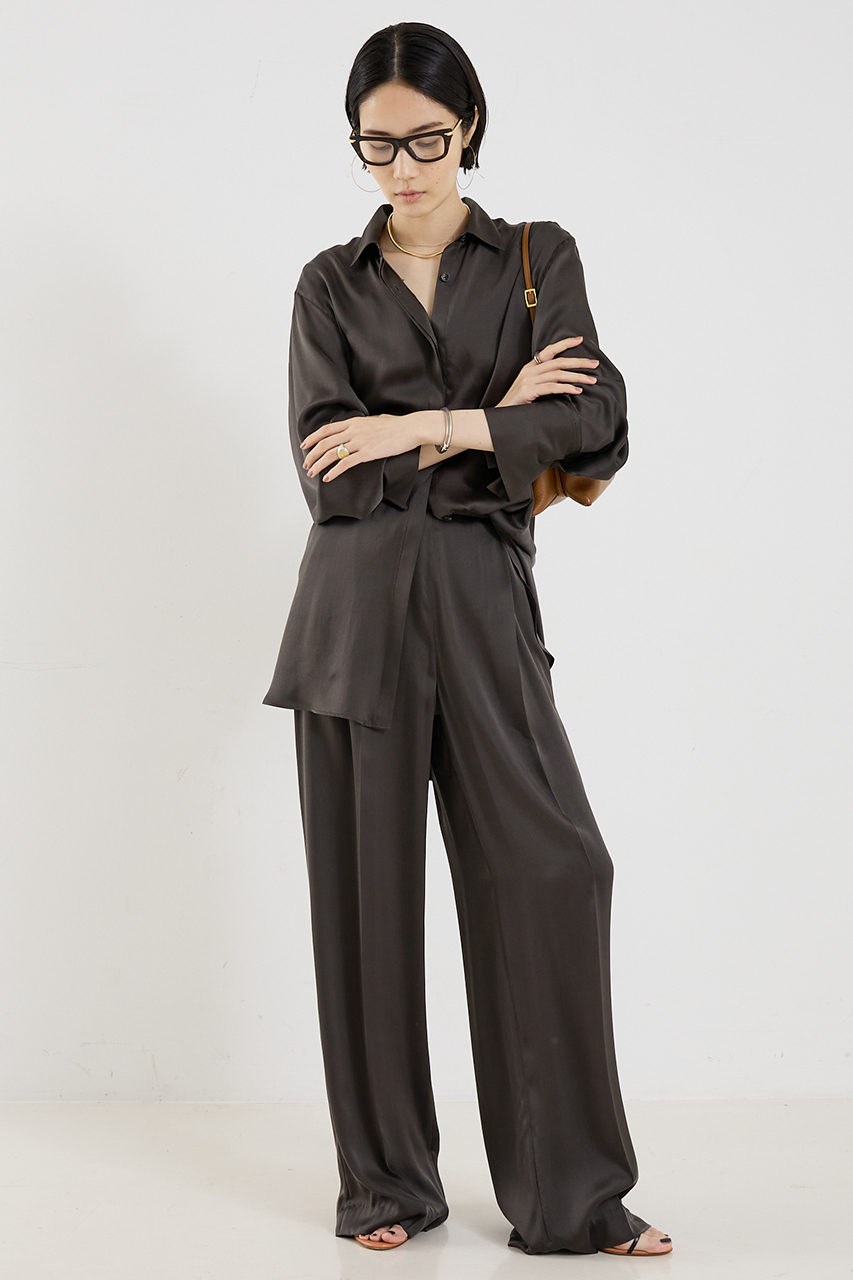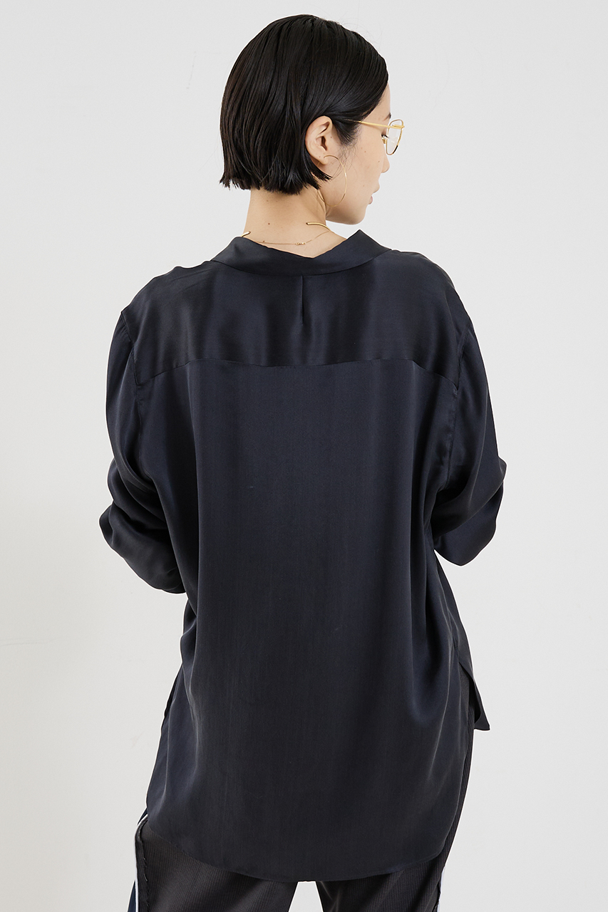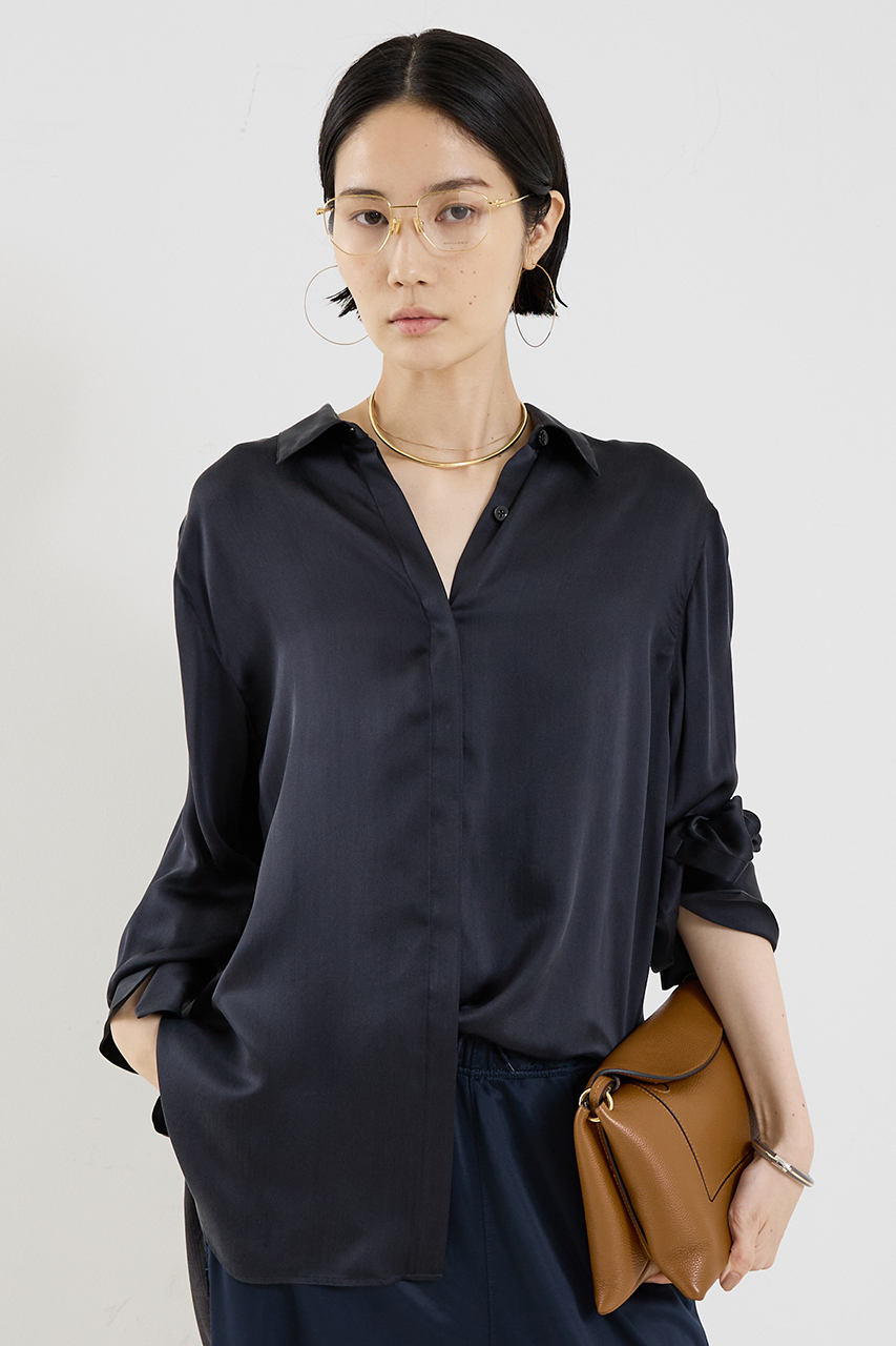 シルクの上品な光沢と美しいドレープが、女性らしい雰囲気を演出してくれるシャツ。シルクサテンにサンドウォッシュ加工を施すことで、パウダータッチのやわらかな質感と快適な着心地を実現しています。シンプルで飽きのこないデザインは、ラフに着崩すことで抜け感のあるスタイリングに。深みのあるダークカラーは上品で取り入れやすく、カジュアルからオケージョンまで幅広いシーンで活躍します。