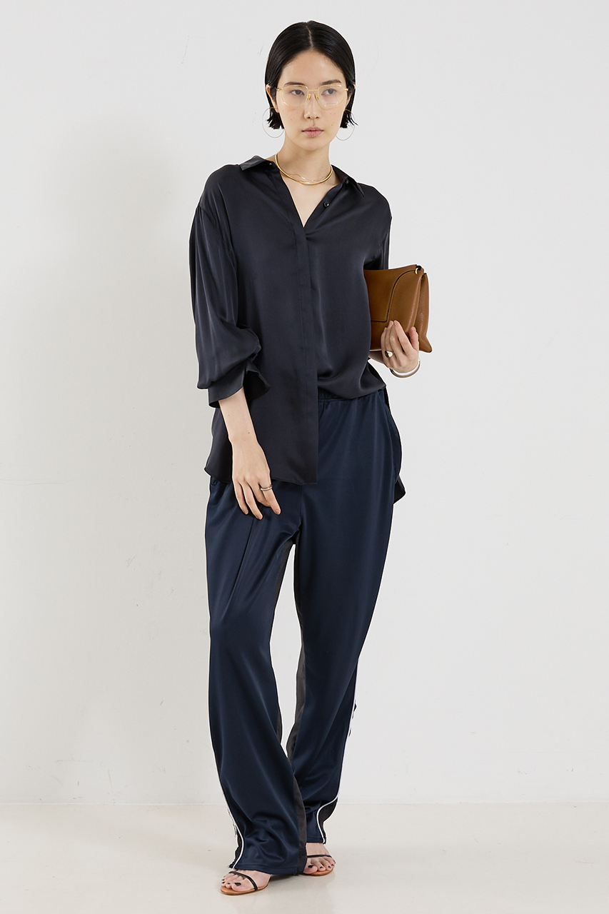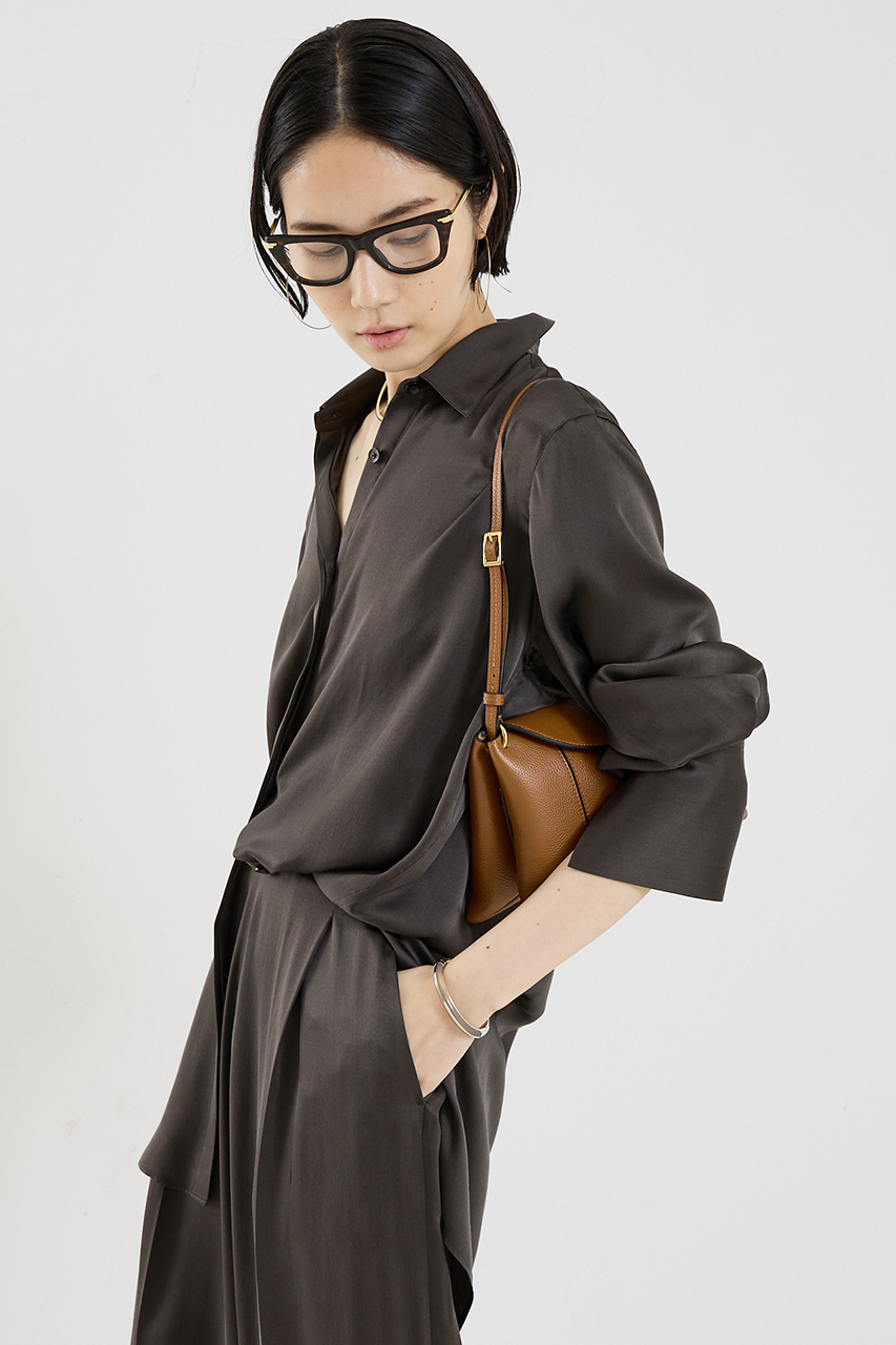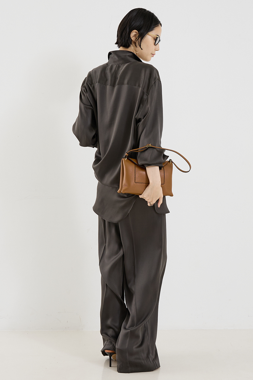 シルクの上品な光沢と美しいドレープが、女性らしい雰囲気を演出してくれるシャツ。シルクサテンにサンドウォッシュ加工を施すことで、パウダータッチのやわらかな質感と快適な着心地を実現しています。シンプルで飽きのこないデザインは、ラフに着崩すことで抜け感のあるスタイリングに。深みのあるダークカラーは上品で取り入れやすく、カジュアルからオケージョンまで幅広いシーンで活躍します。
