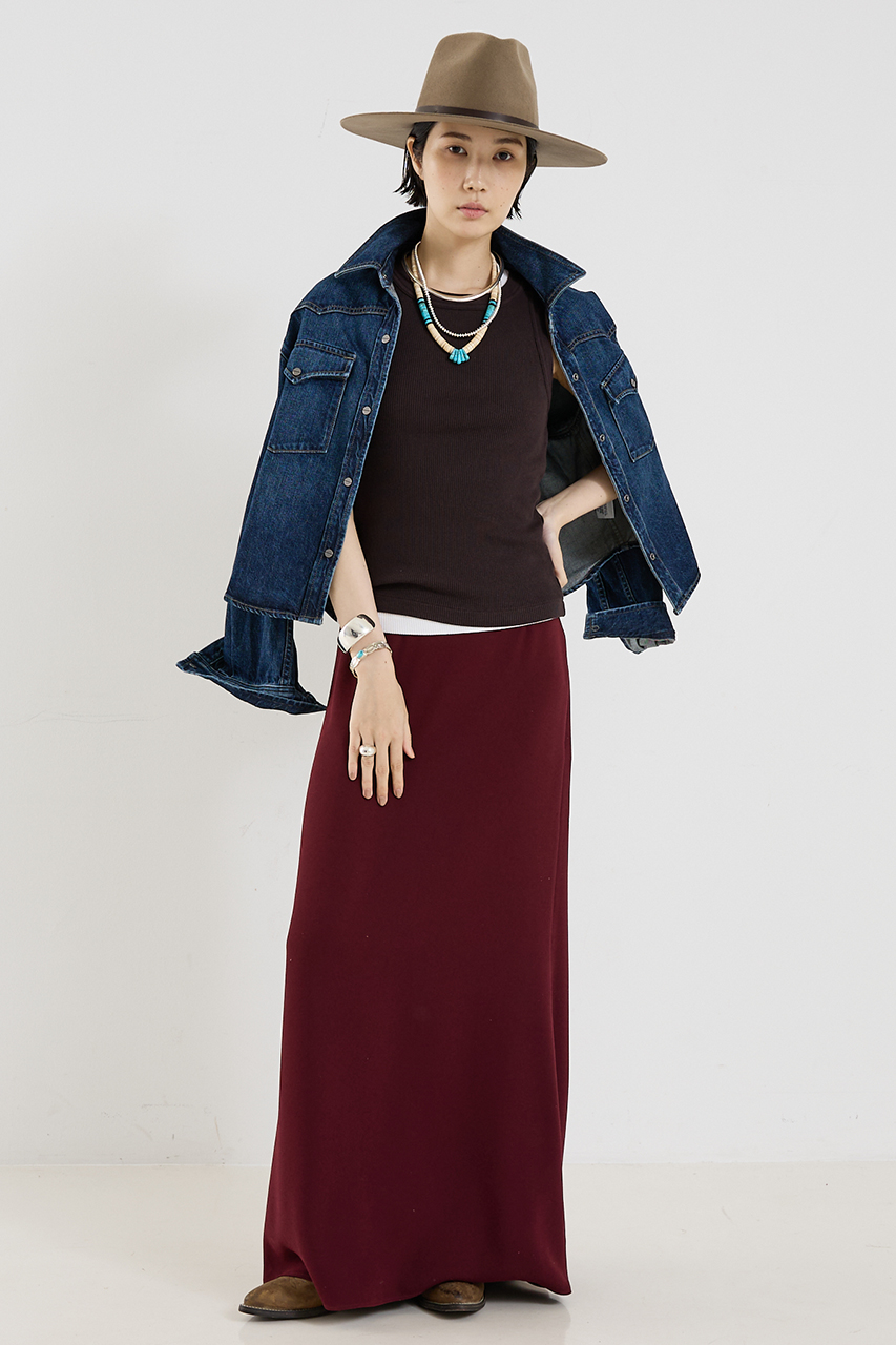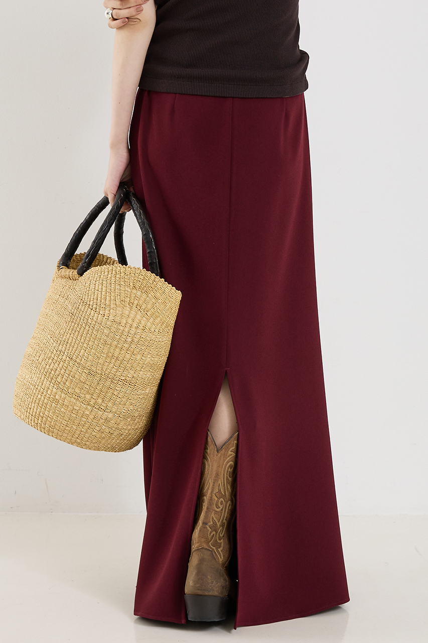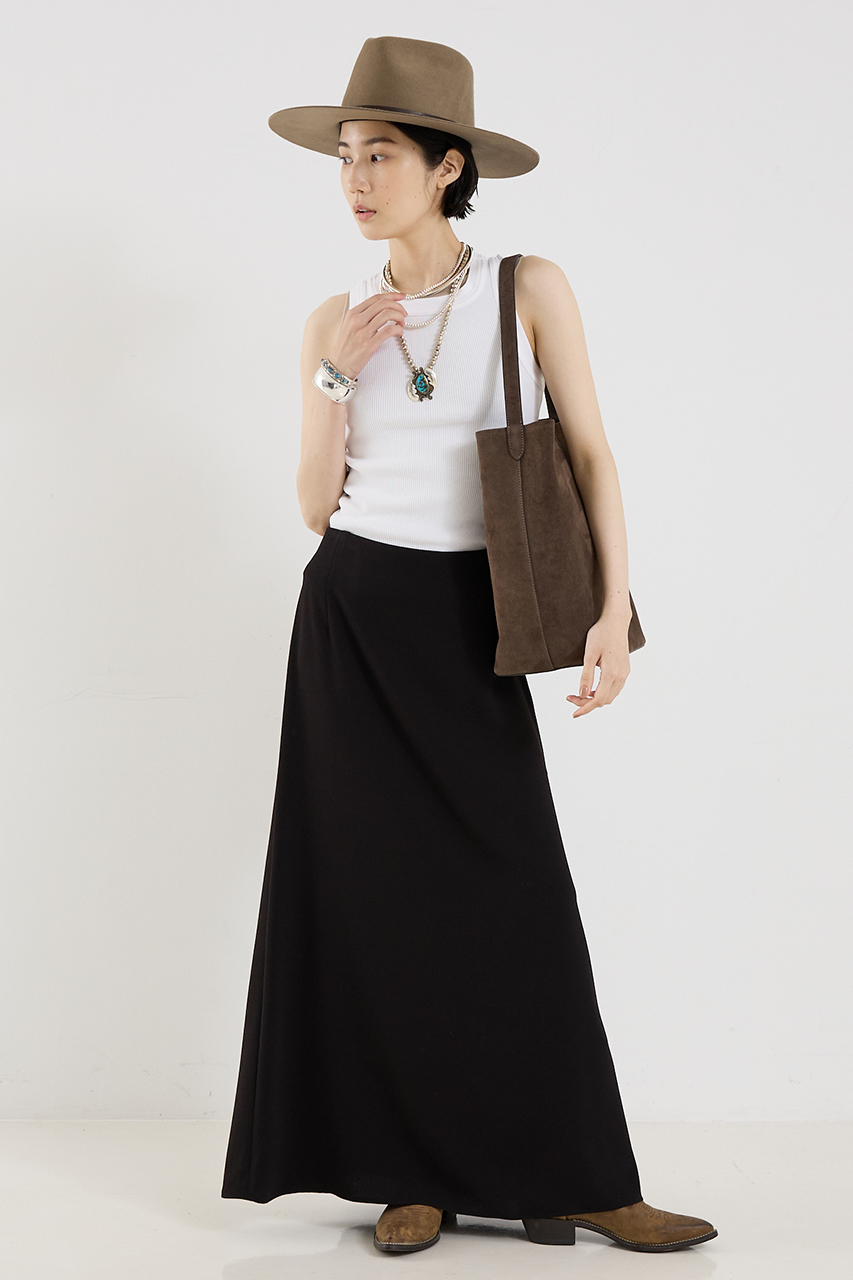 スタイリングしやすく、ワードローブに一枚は欲しいフェミニンなシルエットが魅力のロングスカート。透け感のないなめらかな素材と、ほどよい落ち感がエレガントな印象を引き立てます。トリアセテートのバックサテンを使用し、接触冷感に加えて手洗い可能な機能性も嬉しいポイント。トップス次第で晩夏から秋まで長く活躍してくれる一着です。