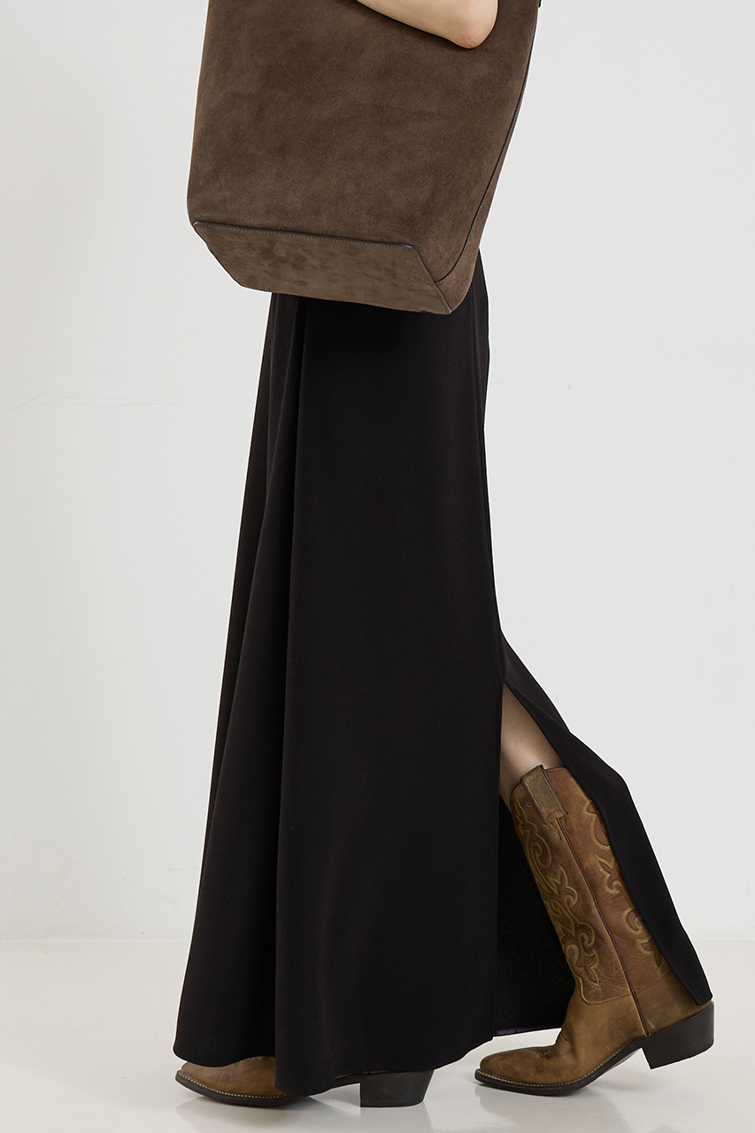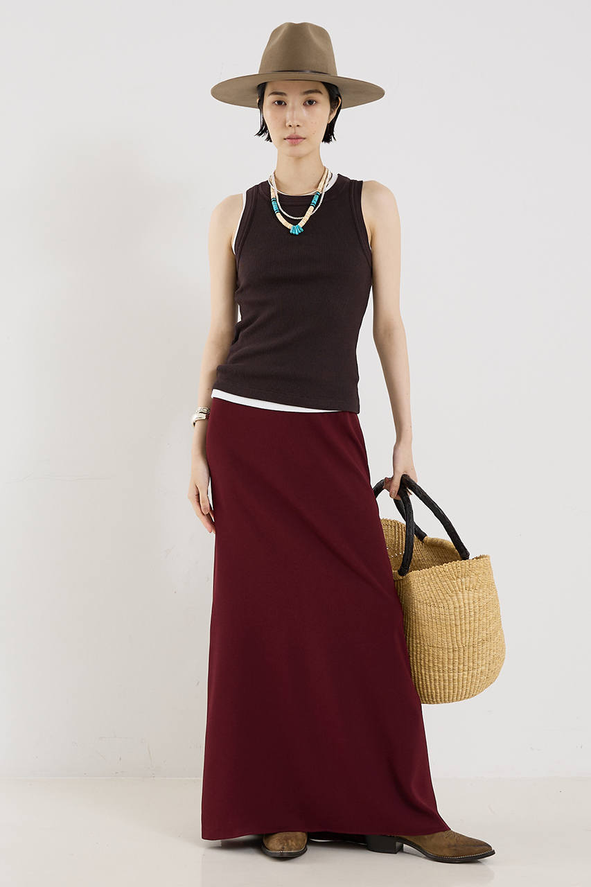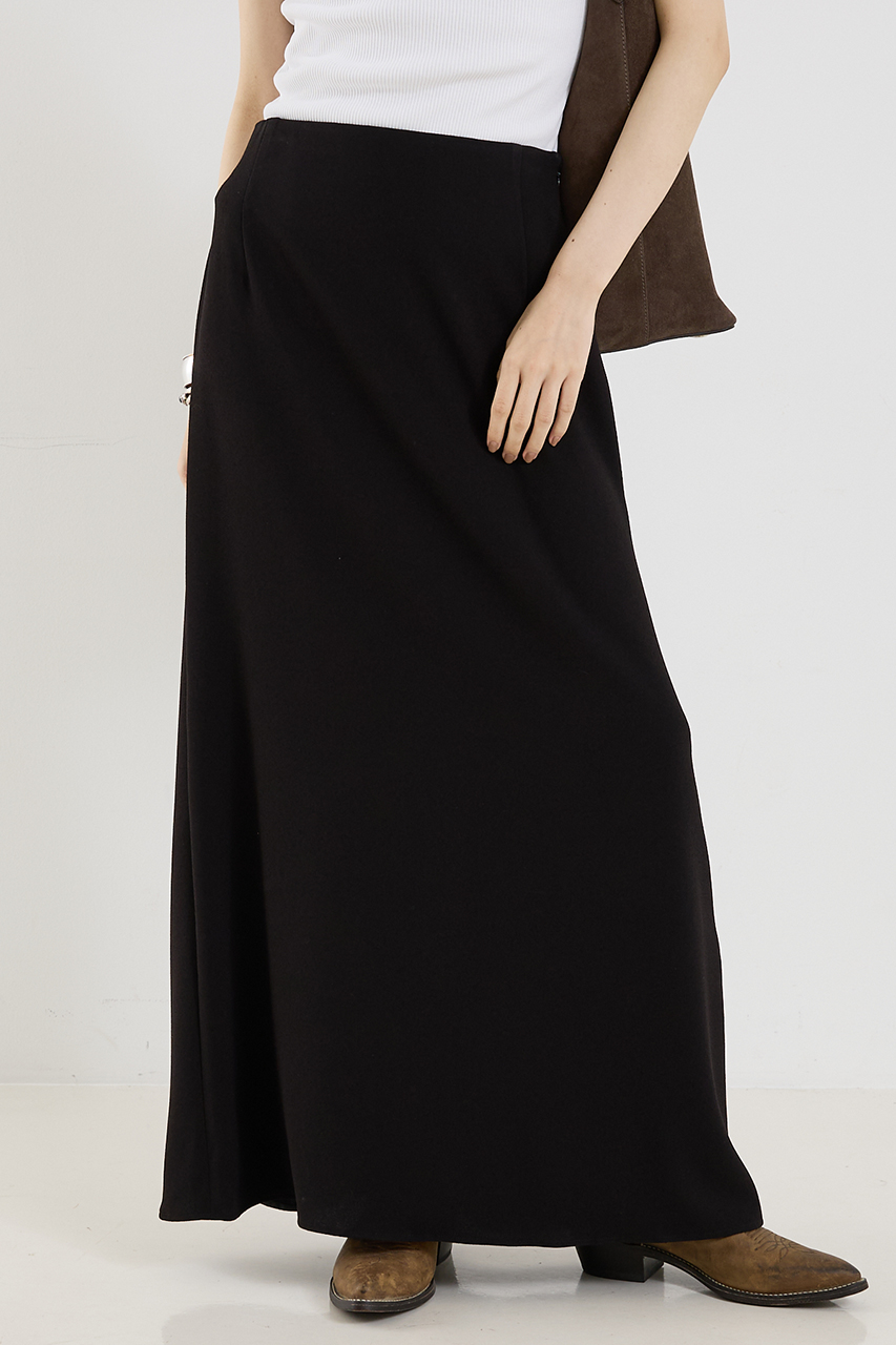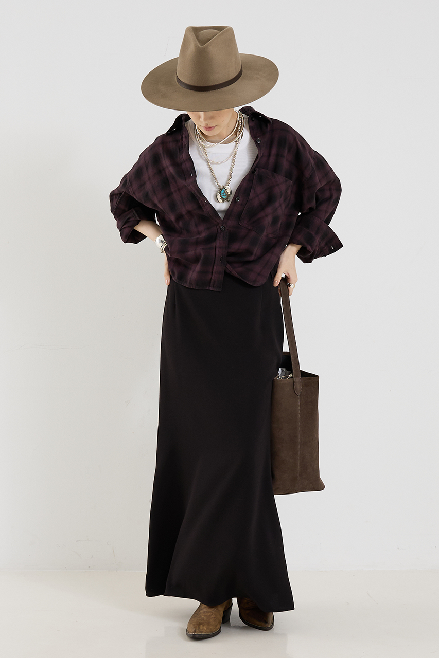 スタイリングしやすく、ワードローブに一枚は欲しいフェミニンなシルエットが魅力のロングスカート。透け感のないなめらかな素材と、ほどよい落ち感がエレガントな印象を引き立てます。トリアセテートのバックサテンを使用し、接触冷感に加えて手洗い可能な機能性も嬉しいポイント。トップス次第で晩夏から秋まで長く活躍してくれる一着です。