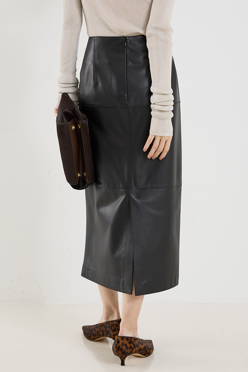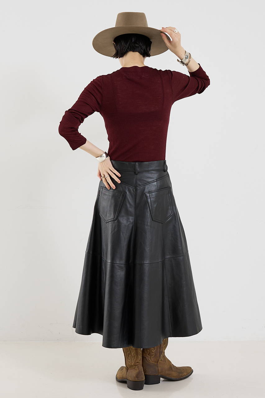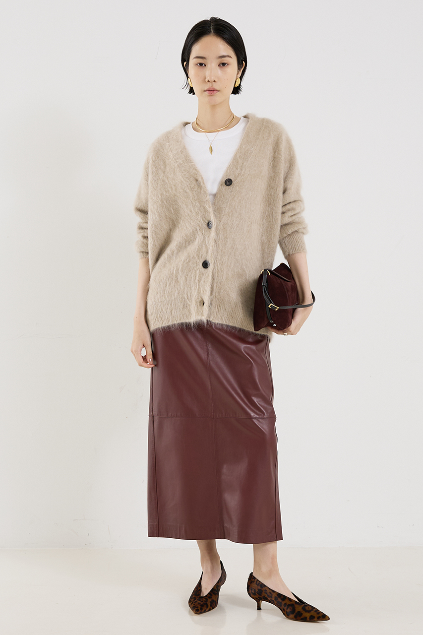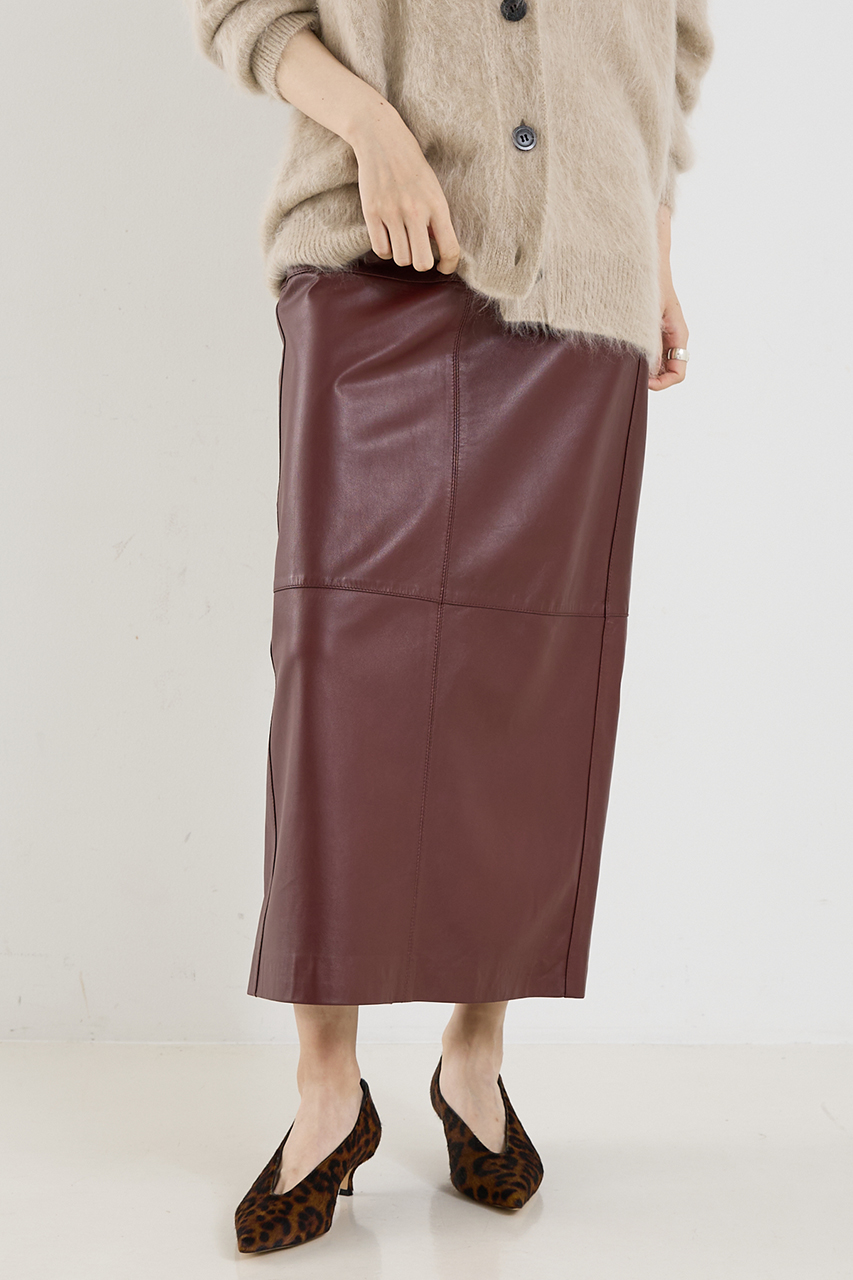 スタイリングをぐっと引き立てる、Iラインシルエットのレザースカート。程よい着丈で、女性らしいバランスの取れたスタイルを演出します。カラーは、華やかなボルドーとモードなブラックの2色展開。エレガントでなめらかな質感のフランス産ラムレザーを贅沢に使用した、上質感あふれる一着です。