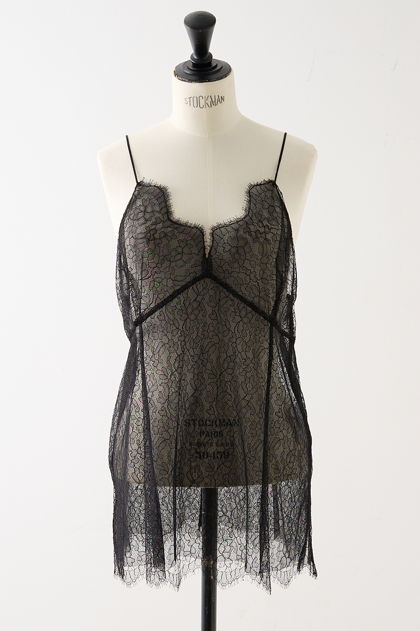 上質なブラックレースのキャミソールは、一枚は持っておきたいタイムレスなアイテム。フランス製の繊細なリバーレースを全面にあしらった、贅沢な一枚です。華奢なシルクの肩ひもと美しいシルエットが、スタイリングにエレガントなムードを添えてくれます。シャツのインナーとしてさりげなく覗かせるのはもちろん、トップスにレイヤードすることで、より女性らしい着こなしが楽しめます。