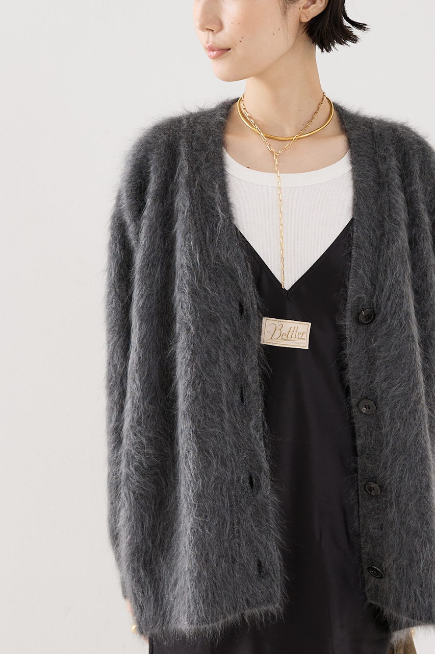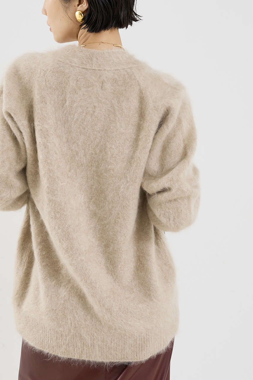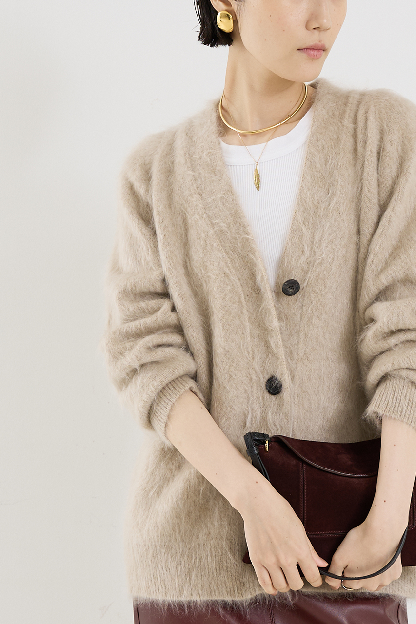 最高級素材にこだわったカシミヤファーニットカーディガン。糸を2本取りにしてボリューム感のある特別な一枚です。ベージュとグレーの上品な色合いが、スタイリングにエレガントなクラス感をプラス。アームにゆとりを持たせたサイジングでレイヤードもしやすく、アウター感覚で着られる暖かさも◎。