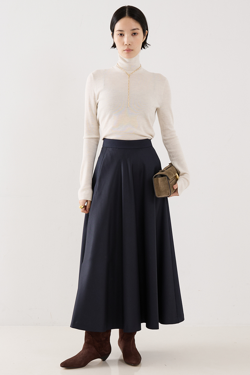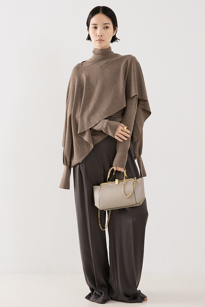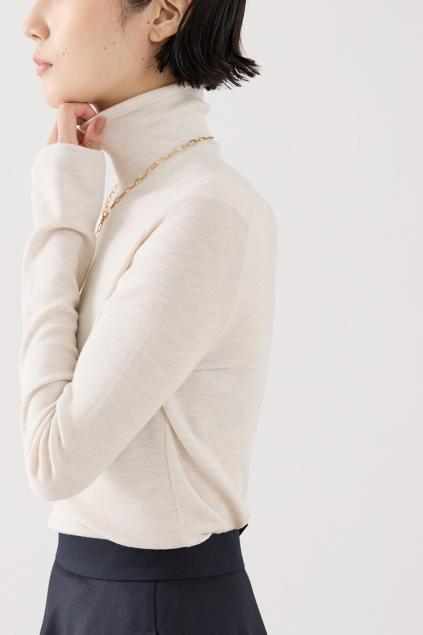 【COCUCA】シグネチャーアイテムのタートルニット。今シーズンはサイドスリットを入れ、細身に見えるウエストラインにアップデート。永く愛用できるエッセンシャルなプルオーバーは、1枚でもシャツやジャケットのインナーとしても活躍します。同素材のストールニットは、タートルに重ねたり、ラフに肩掛けや腰巻きにして、その日の気分でアレンジ可能です。