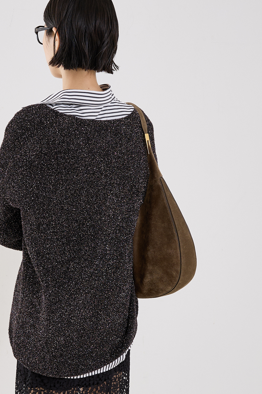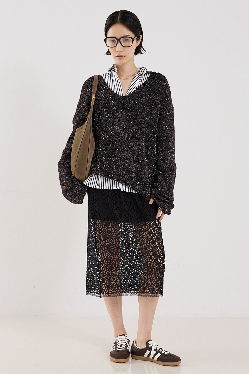 ブラックラメが上品に煌めくフェザーニット。美しいVラインと抜け感のあるゆったりシルエットで、シャツとのレイヤードもエレガントに。フェザー糸とラメ糸を組み合わせた素材は、イタリアインポートならではの艶感が魅力です。