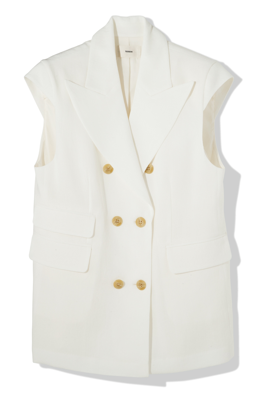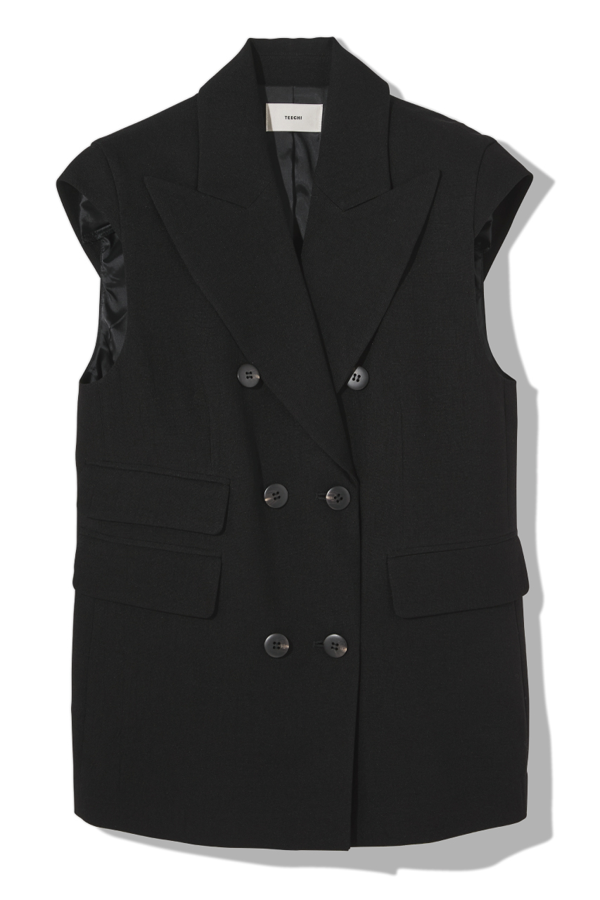 マニッシュな印象のダブルブレストデザインと厚みのある肩パッドが、モードな印象のノースリーブジャケット。テーラードの品格とノースリーブの抜け感が共存する、オンからオフまでシームレスに活躍する汎用性の高いデザイン。