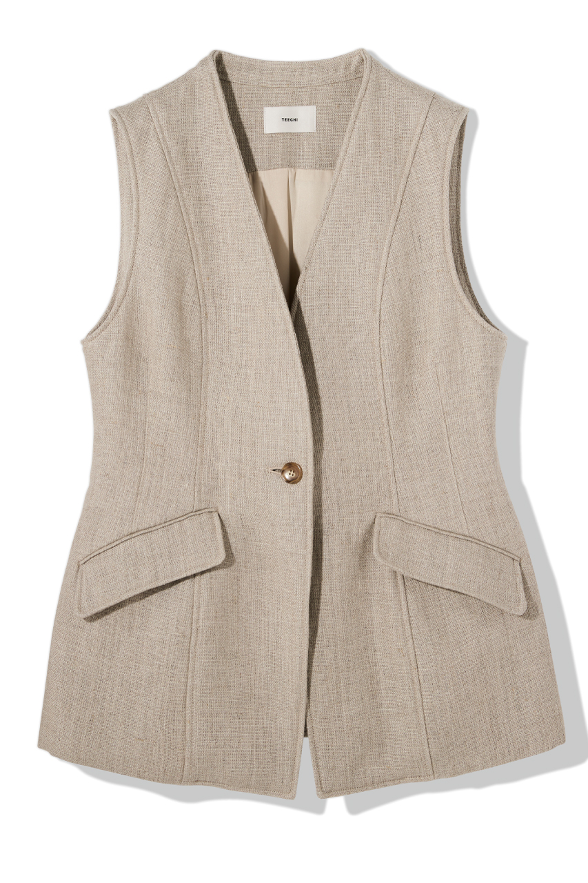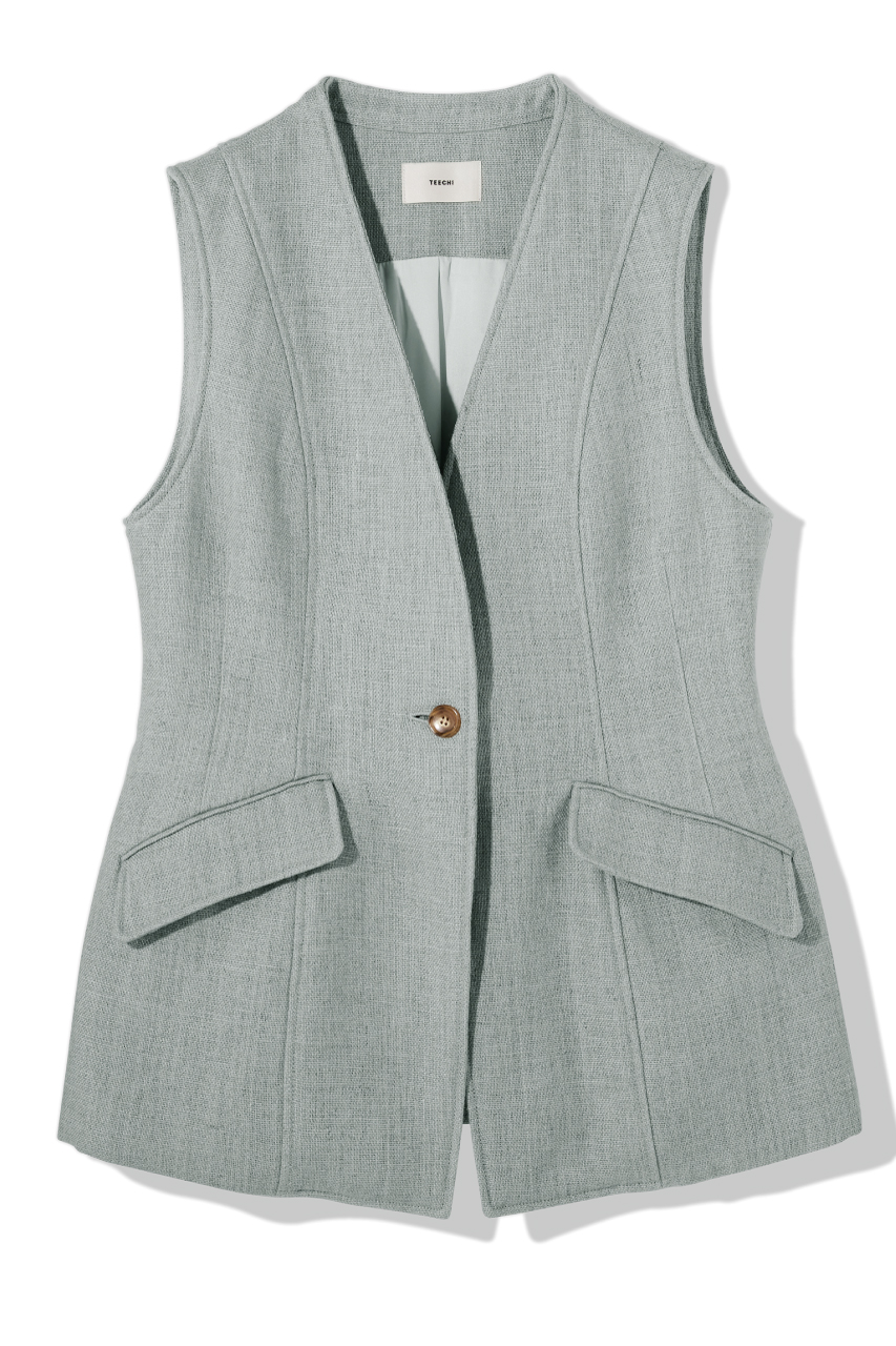 フロントのひとつボタンを留めると自然に美しいウエストラインが生まれる、テーラードジャケットのような立体的なパターン設計。ジレとしては長めの着丈設定によりスポーティなパンツをモダンな印象に仕上げる。キュプラを使用した裏地により素肌に触れてもストレスなく着用可能。