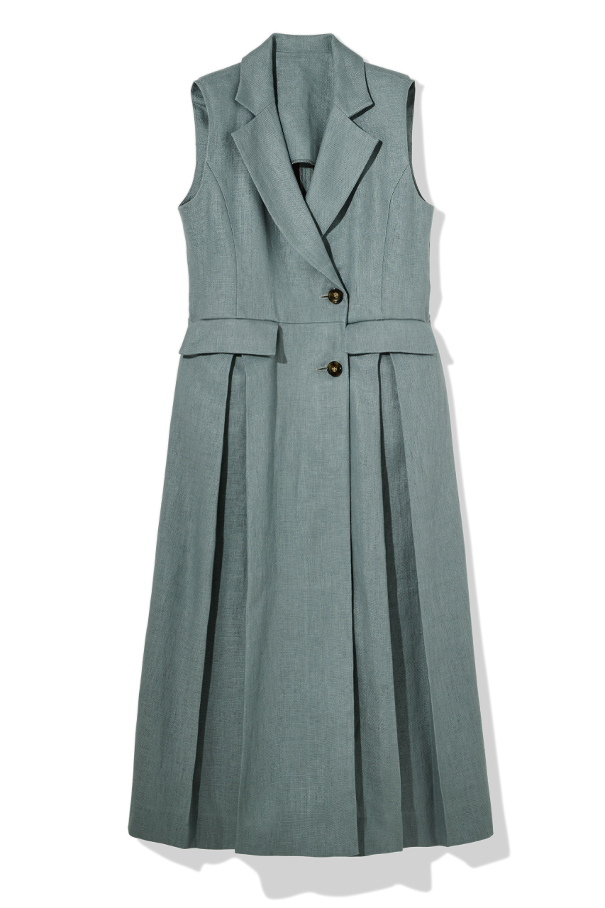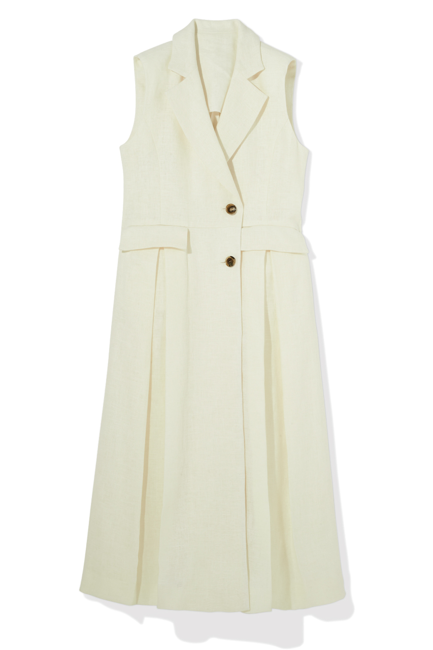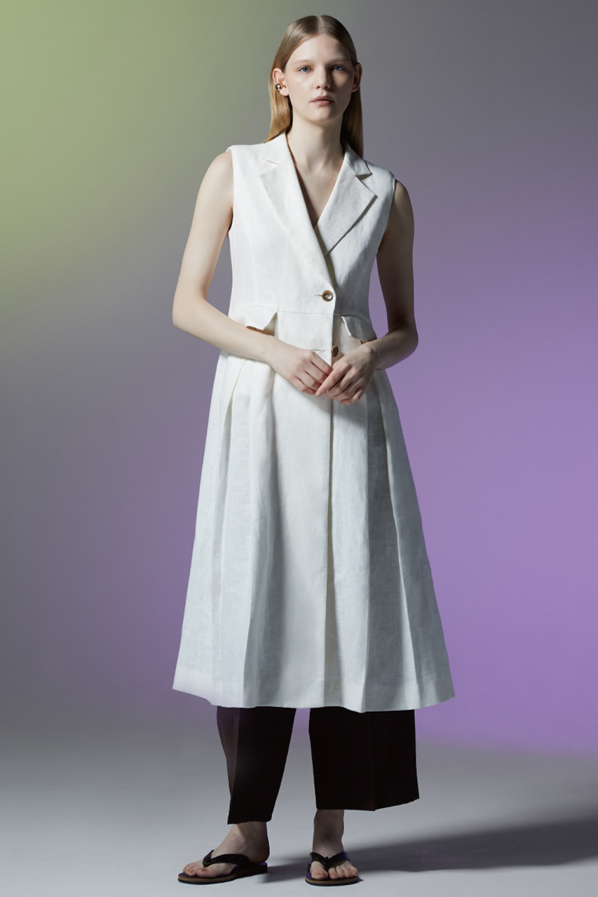 幅広のピークドラペルが際立つ、マニッシュな印象を与えるダブルブレストデザインのノースリーブジャケット。腰ポケットのフラップから深めにとられたプリーツでロングスカートを着用した時のような、洗練された大人の雰囲気に。
