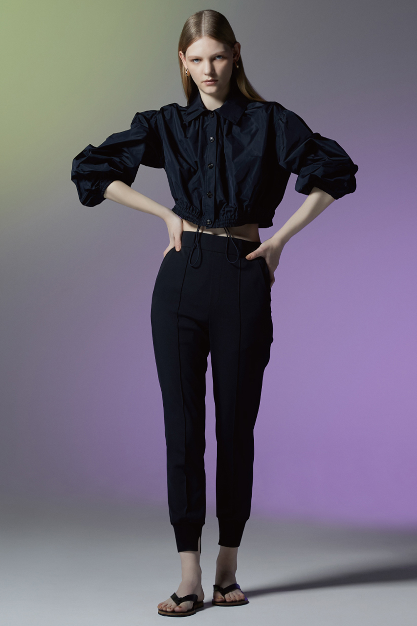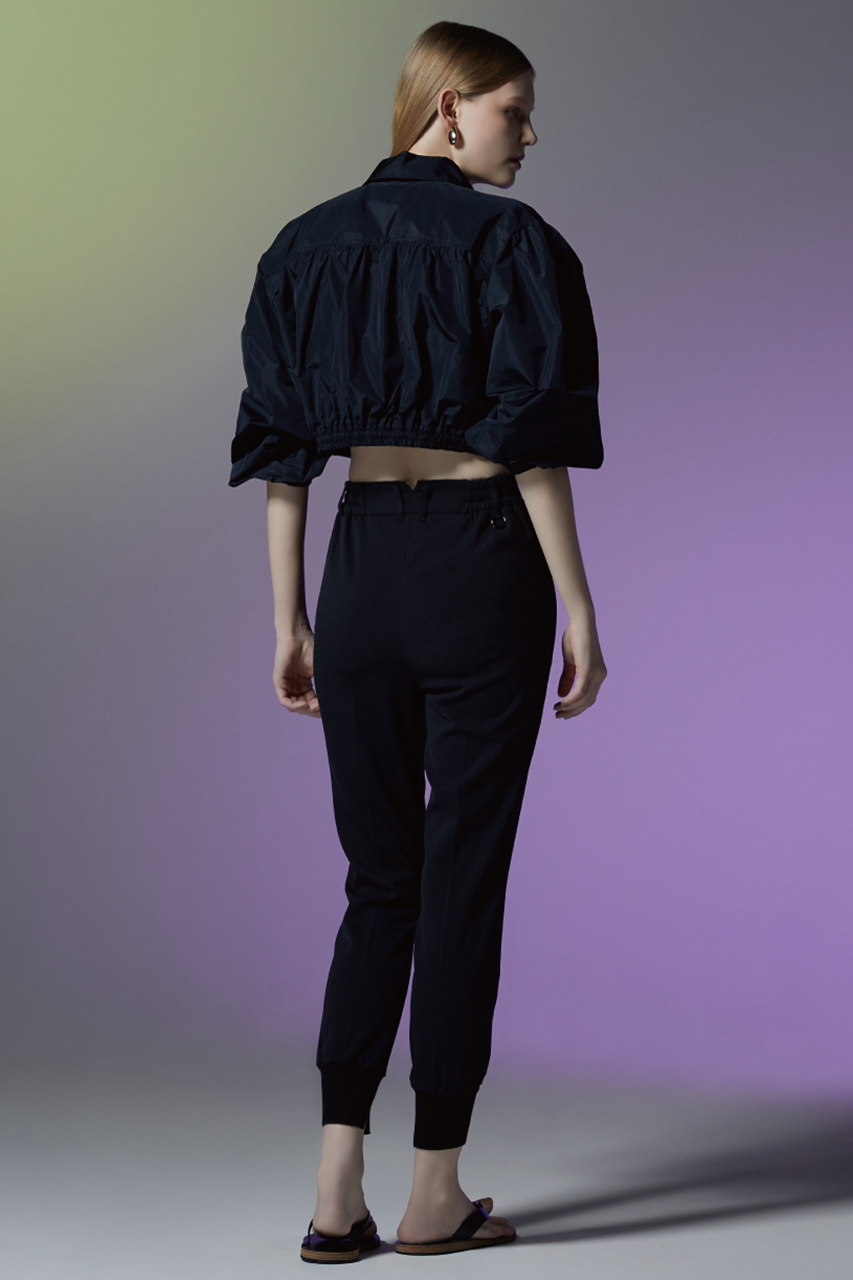 「ティーチ」を代表するジョガー「エニウェイパンツ」。4wayストレッチ素材に加えアクティブな動きも美しく見せる計算し尽くされたデザイン。繊細なリブ使いや足首のスリットでサンダルからパンプスまで、着る人のスタイリングを拡張する。さらに素材の上質感はそのままに、いつでも着用できるように、はっ水加工を施しました。