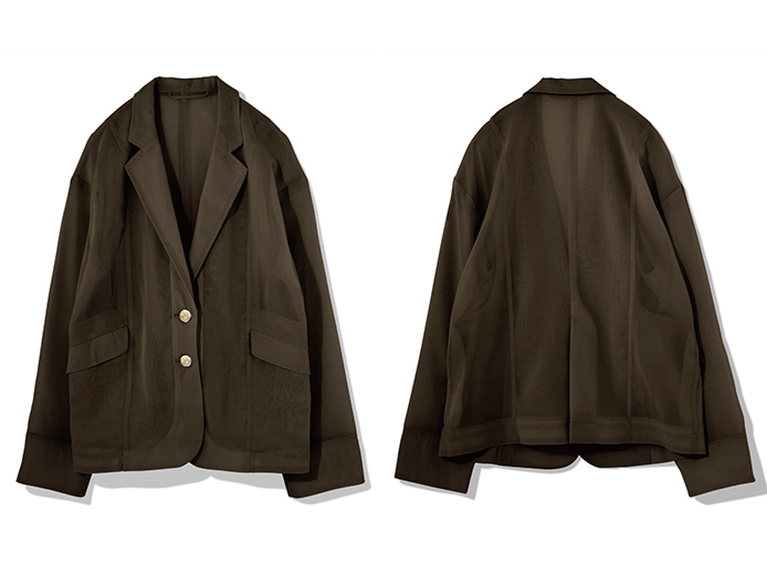 シアー素材を天然繊維で仕上げたことで、繊細な透け感と落ち感が美しいコットンオーガンジージャケット。ジャケットが必要なオフィスでの会議から、アフターワークに訪れた美術館やレストランの空調対策まで、シャツ感覚で羽織ることが可能。袖口に向かって長く広めにデザインされた袖は、ロールアップの仕草を美しく見せてくれます。