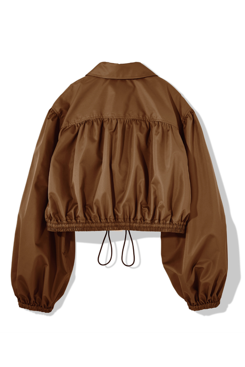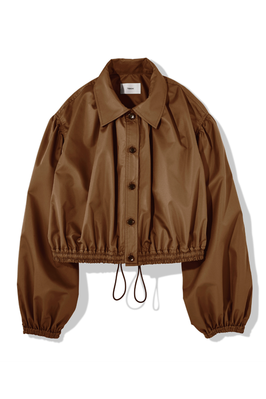 スポーツウェアを思わせるナイロン素材やトラックジャケットのディテールに、丸みのあるフォルムやギャザーを組み合わせた、今のムードにフィットした一着。