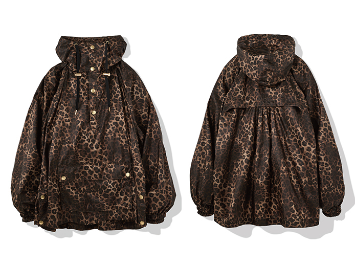 ブラウンとともに、25AW注目の「レオパード」柄を施した、しなやかで軽量ナイロン製のアノラックジャケット。スポーティなアイテムでありながらメタルボタンやドローコードのゴールドが、都会的な雰囲気を演出。