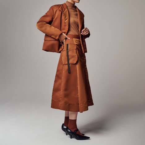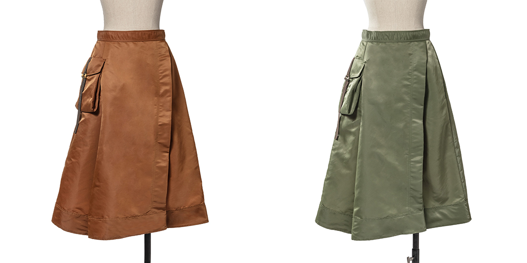 ミリタリーのディテールを引き継ぎながら、サテンの光沢で仕上げたミディ丈。シャープなのにどこかフェミニン——そんなバランスが、今の気分にぴったり。立体感のあるシルエットで、ワンアイテムでもコーデが決まる存在感。主張しすぎず、埋もれない。