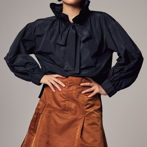タフタ素材のほどよい光沢とハリ感が、軽やかでモードな印象に。
