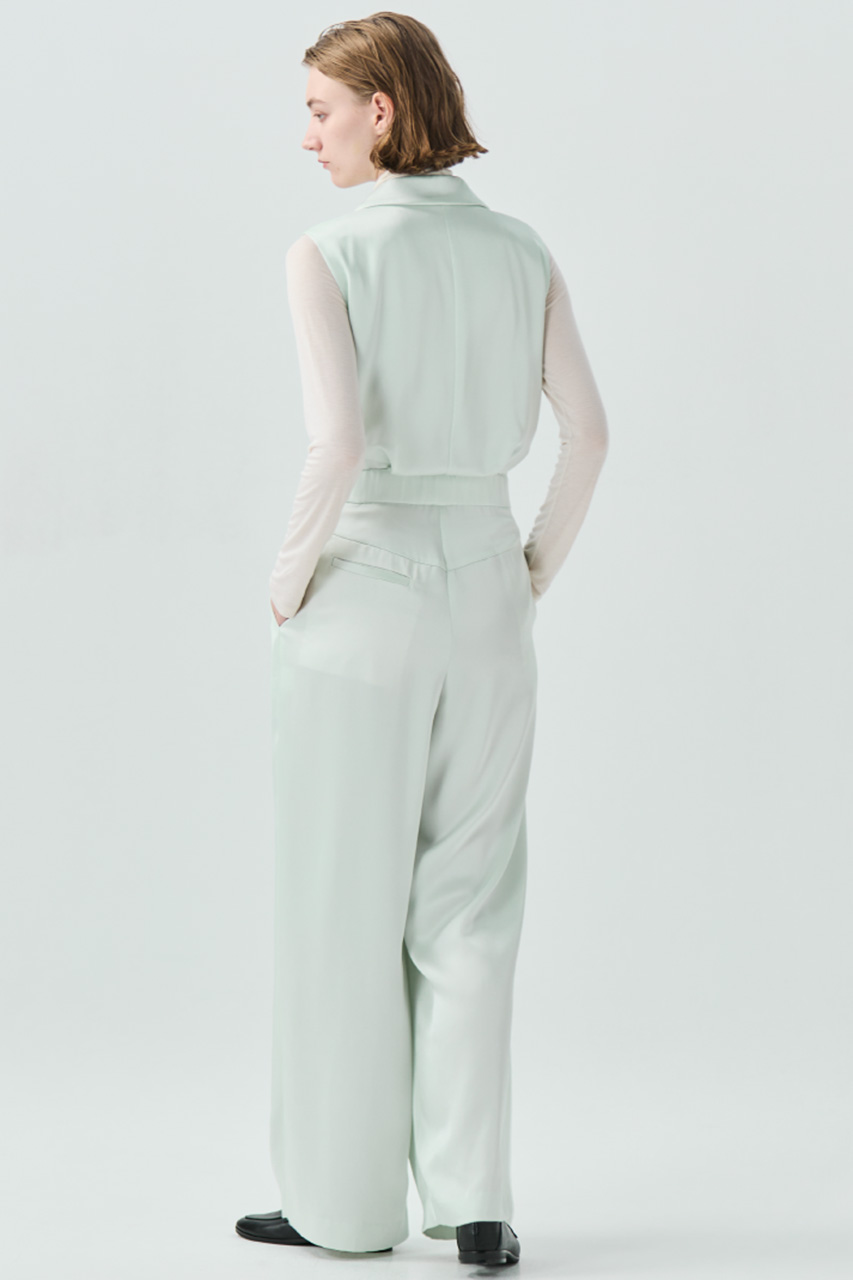 ジャンプスーツの存在感はそのままに、スタイリング次第でカジュアルにもエレガントにも表情を変えるサテン生地のジャンプスーツ。