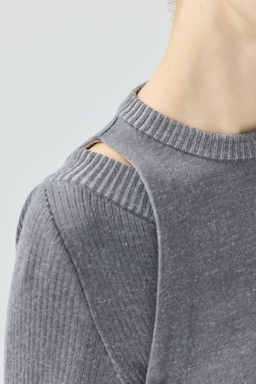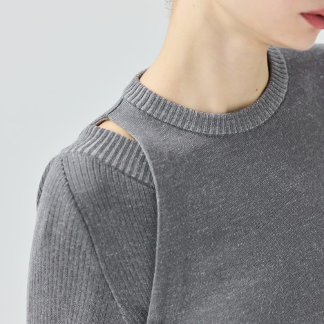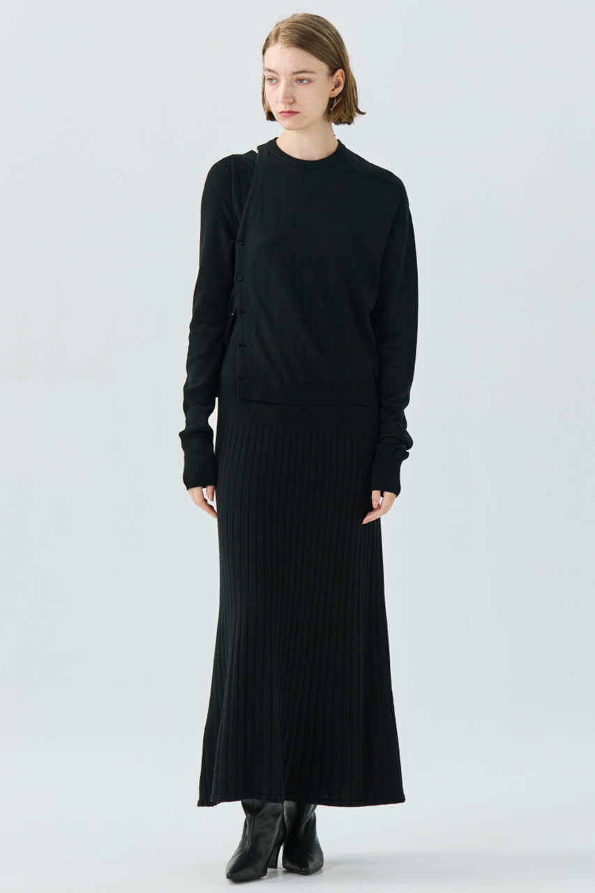 カーディガンは右腕、ワンピースは左腕をノースリーブに仕立て、重ねて着ることで計算された肌見せが生まれます。