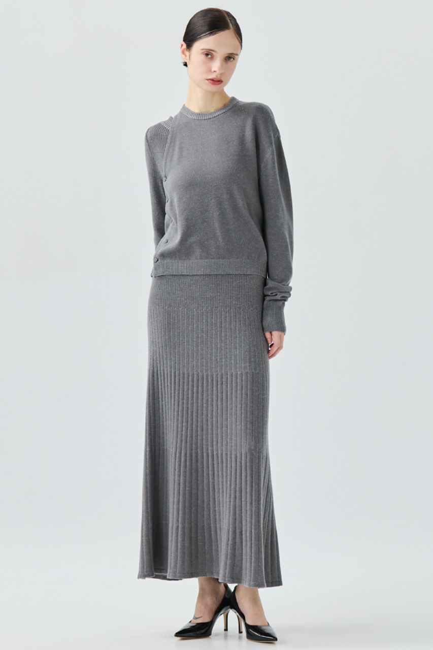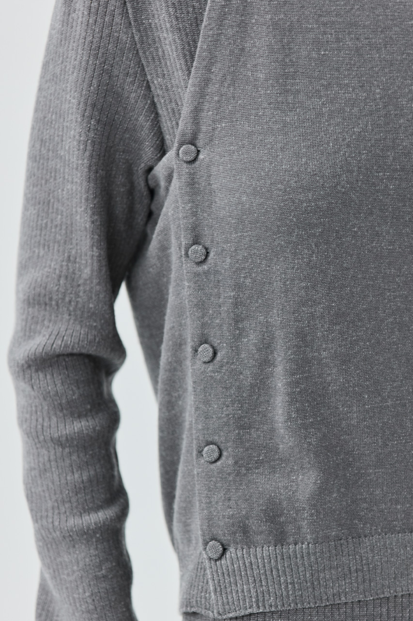 脇に配されたカーディガンのボタンは、留め方次第でシルエットにさまざまな表情をプラスします。