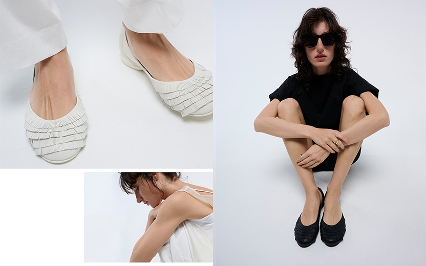 フリンジディテールを都会的に昇華した、シティユースなサンダル。しなやかに揺れるディテールが歩くたびにリズムを生み、シンプルな夏の装いを印象的に引き立てます。足の形に寄り添う木型設計と、甲をしっかり包み込むアッパーで、見た目以上の安定感をキープ。モードにもカジュアルにもフィットし、スタイリングの主役として活躍。