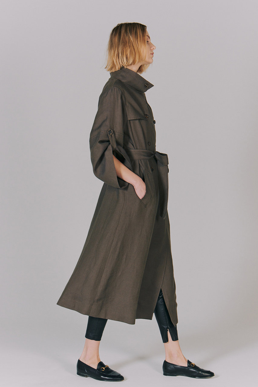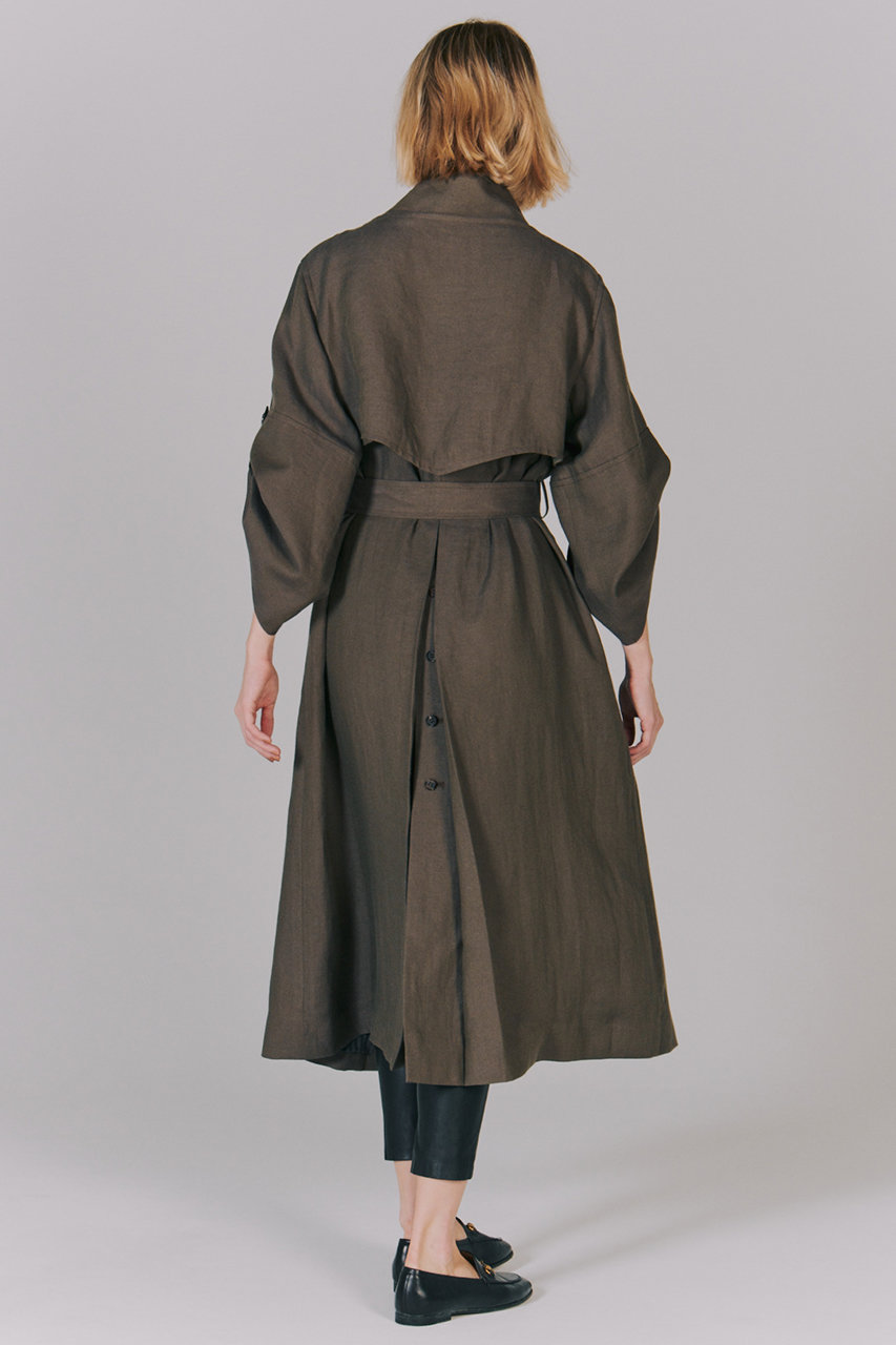 やや光沢のあるドライタッチなリネン生地を使用した、ニュアンスのある風合い