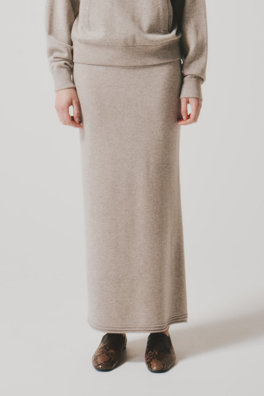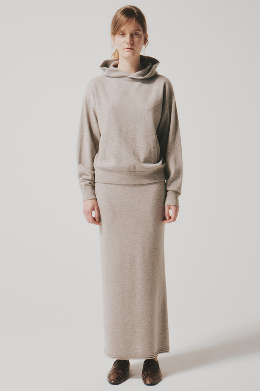 デイリールックに上品さと女性らしさを纏ってくれるスカート。カシミヤをブレンドした、しなやかでさらっとした極上の着心地がやみつきに。ロング丈とタイトシルエットが大人っぽく、ボディラインを美しく魅せてくれそう。ショート丈トップスからオーバーサイズのニットまで着こなしの幅が広い1着。同素材のカシミヤ フーディ トップスとのセットアップもおすすめ。