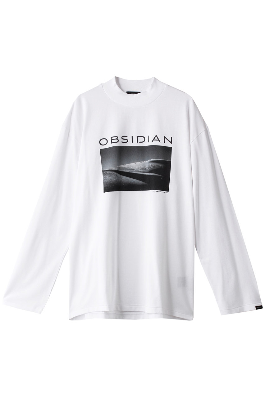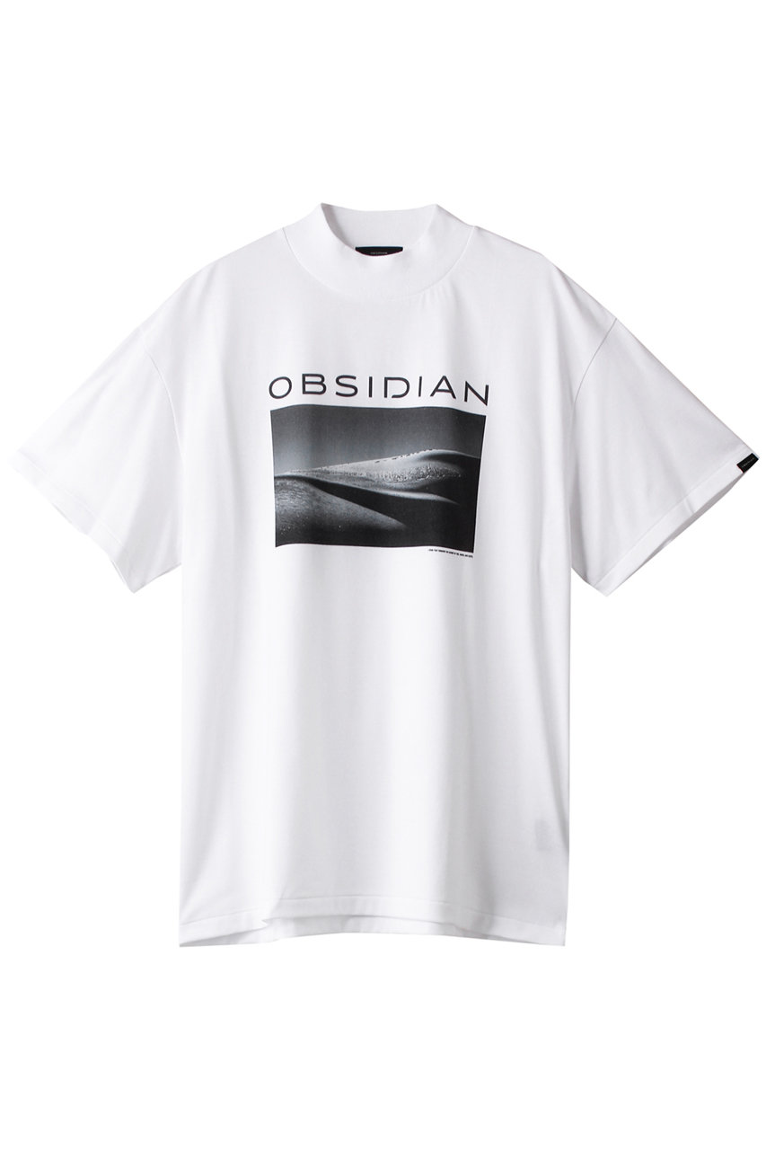 モックネックで上品さを添えた大人のためのTシャツ。ロゴとフォトプリントが映えるデザインで、コットン100%の快適な着心地と光沢感が魅力。