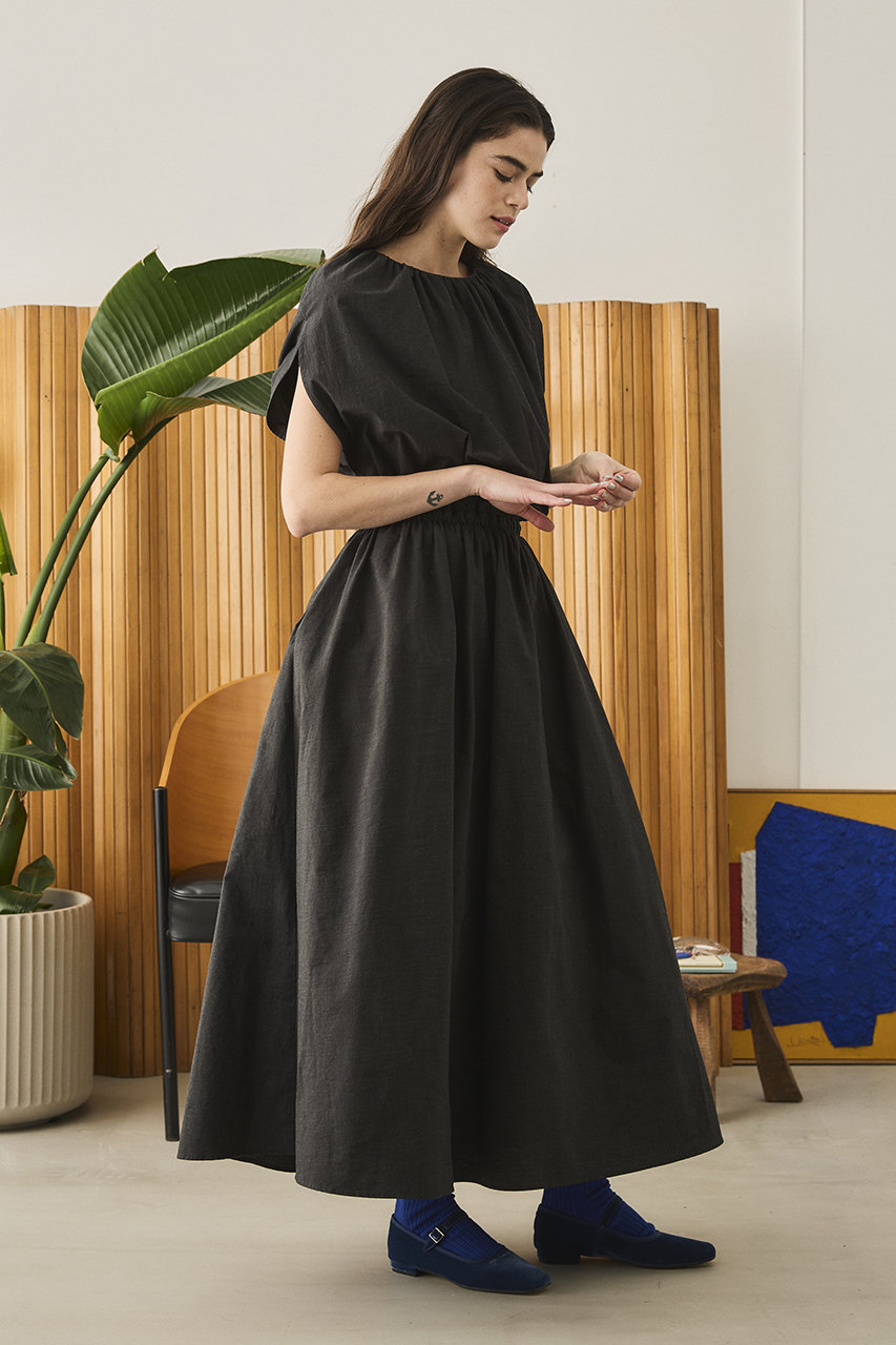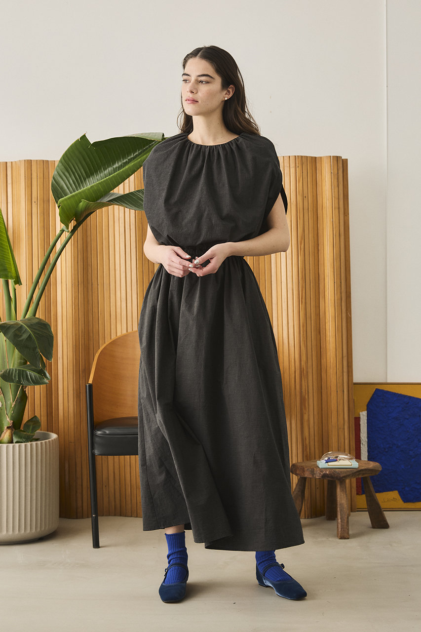 ノースリーブながらドロップショルダーで腕まわりをさりげなくカバーしてくれるワンピース。風通しがよく涼しい着心地で、夏のお出かけからディナーまで幅広く活躍してくれる一枚です。